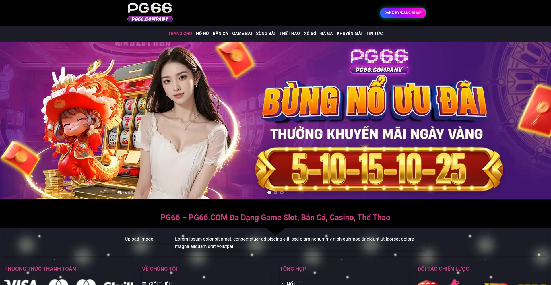 PG66 là nhà cái cá cược trực tuyến uy tín với hệ thống slot, bắn cá, casino, thể thao và xổ số. Ưu đãi lớn, nạp rút nhanh, bảo mật cao v�...