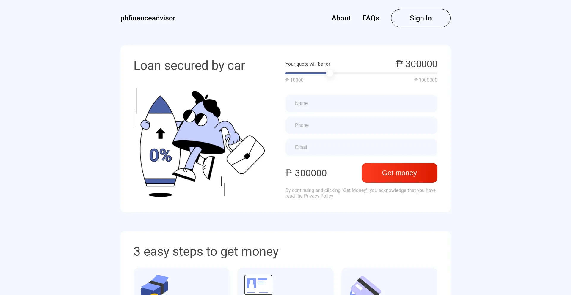 该网站实现数据收集表单,请求个人信息,包括姓名、电子邮件地址、电话号码或其他敏感详细信息。用户应验证 phfinanceadvisor.com 的合法性并在提交个人数据前查看隐私政策。