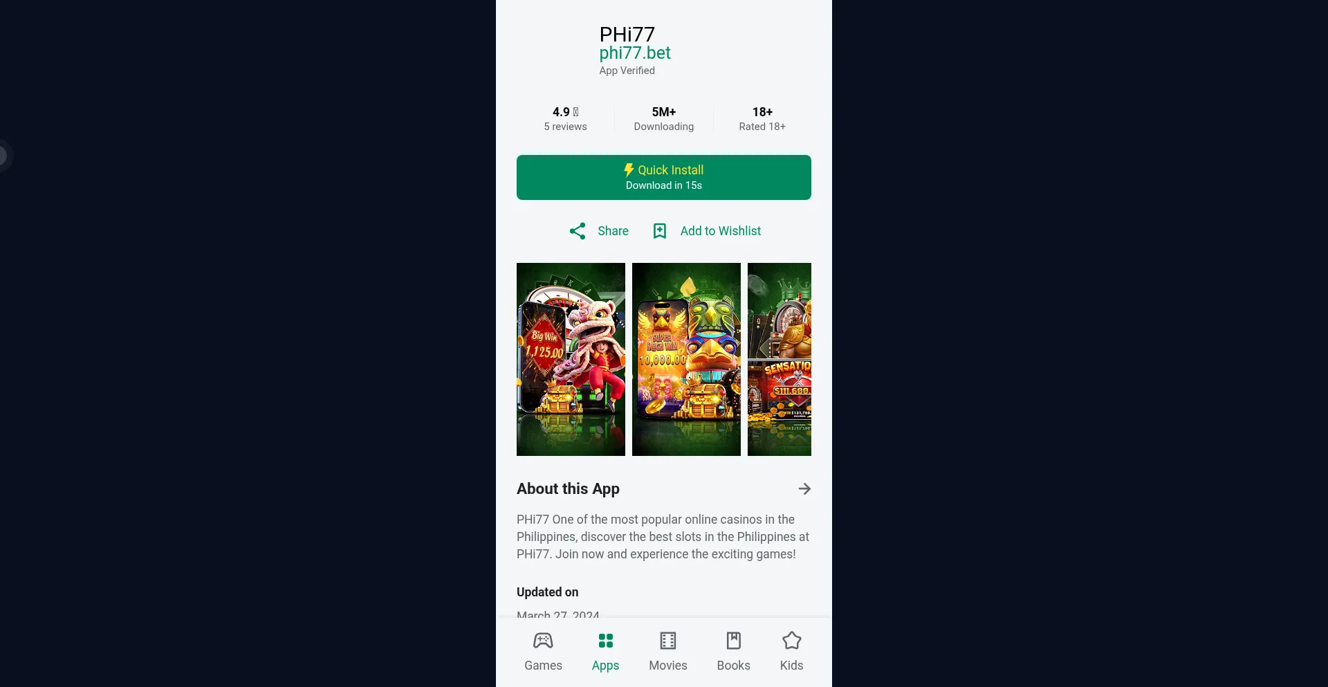 网站 phi77a.com 被配置为一个带有移动应用功能的网络应用。用户可以直接将该网站安装到设备的桌面上,以快速访问并享受类似移动应用的体验。