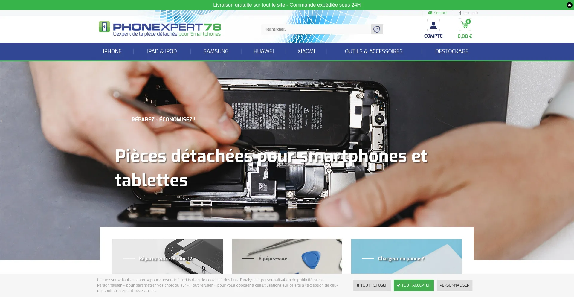 Pièces détachées smartphones et tablettes : écran LCD vitre tactile, batteries, composants pour iPhone, iPad, Samsung, Huawei, Xiaomi. Outillages et accessoires.