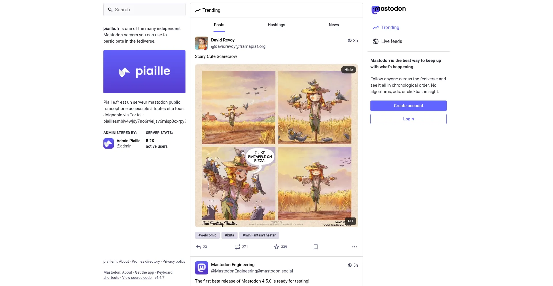 Piaille.fr est un serveur mastodon public francophone accessible à toutes et à tous. Joignable via Tor ici : piaillesmbiv4wjdy7no6r4eijsv6mlsp3cxrpy37dhmose2jwyqdrid.onion