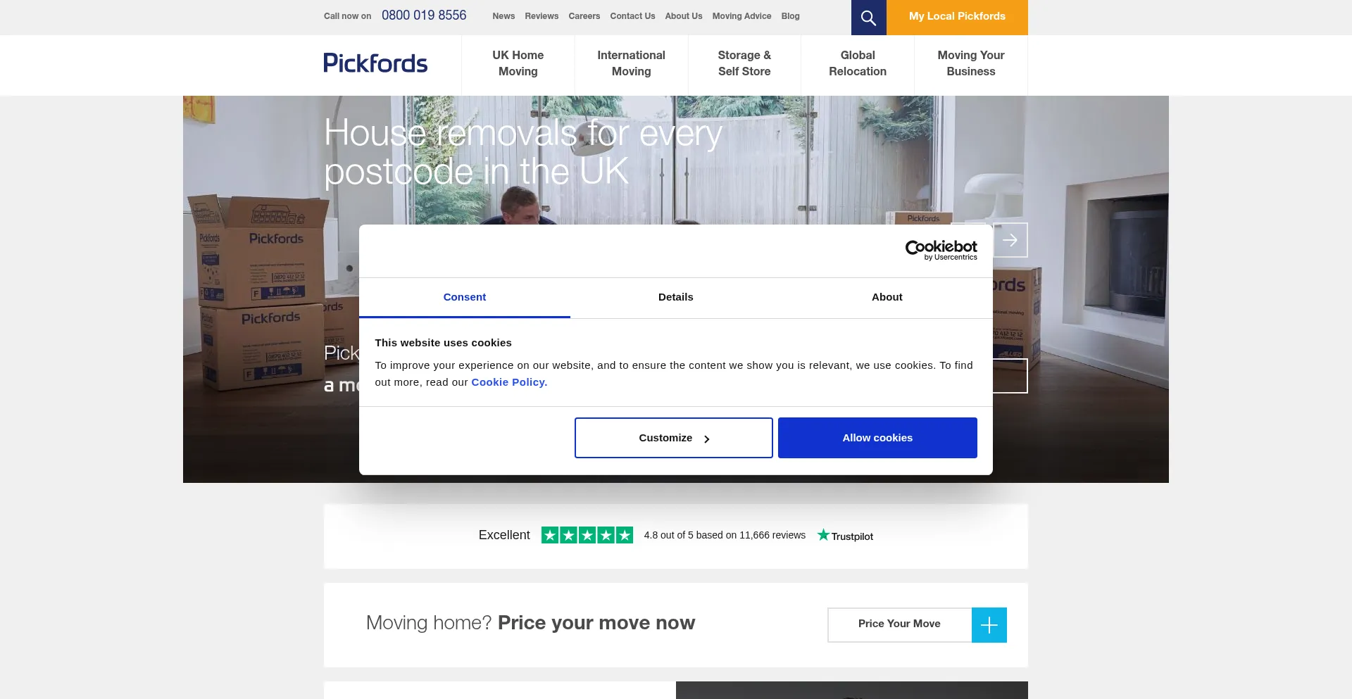 该网站实现符合GDPR或CCPA等隐私法规的cookie同意机制。这表明 pickfords.co.uk 遵守数据保护标准并为用户提供对个人数据收集实践的控制。