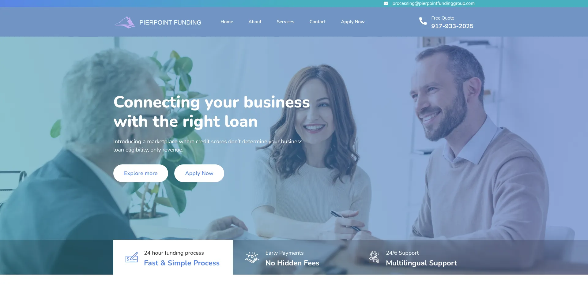 该网站实现数据收集表单,请求个人信息,包括姓名、电子邮件地址、电话号码或其他敏感详细信息。用户应验证 pierpointfundinggroup.com 的合法性并在提交个人数据前查看隐私政策。