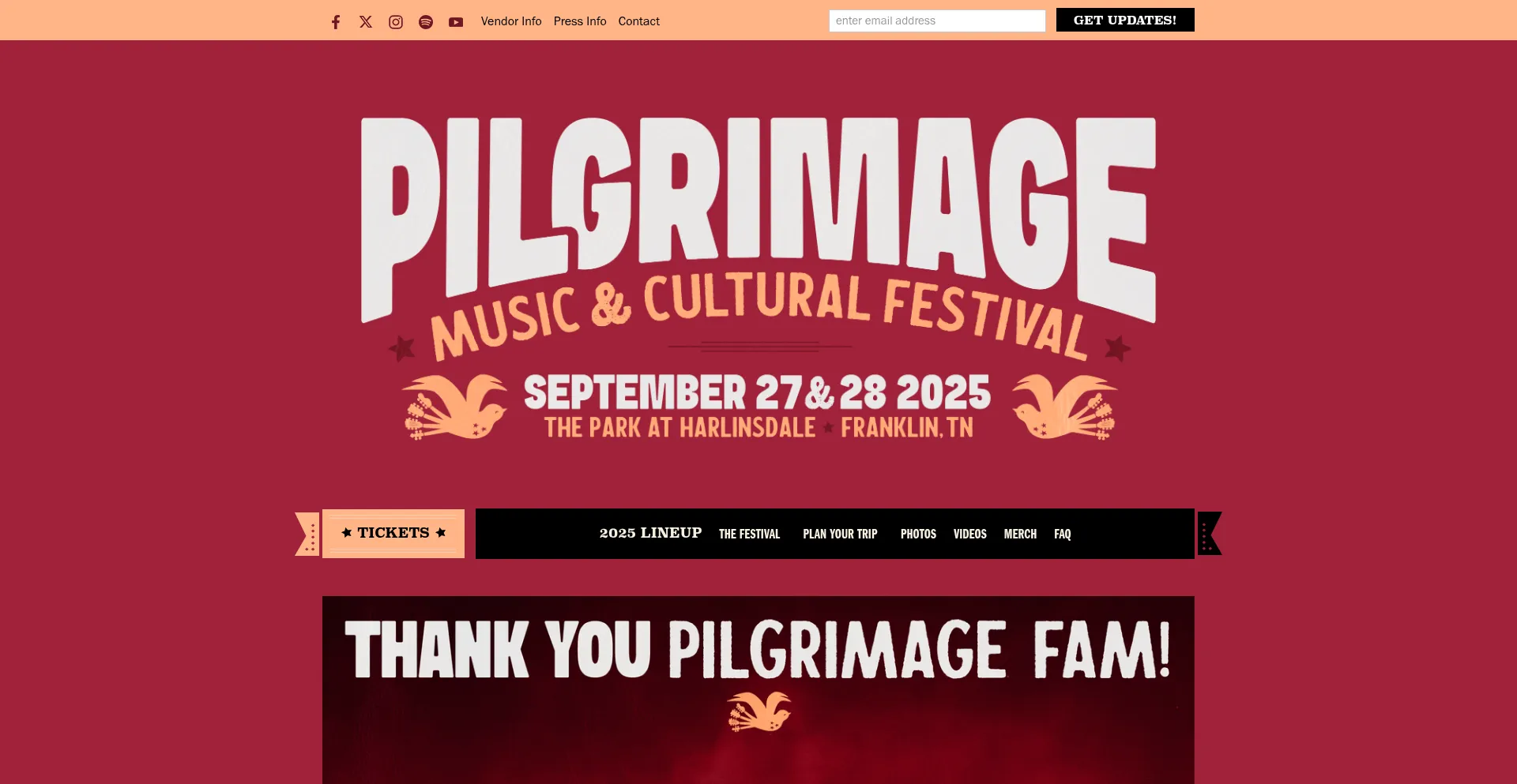网站上存在社交媒体链接表明 pilgrimagefestival.com 在社交媒体上维护官方账户,这是可信度和参与度的积极信号。