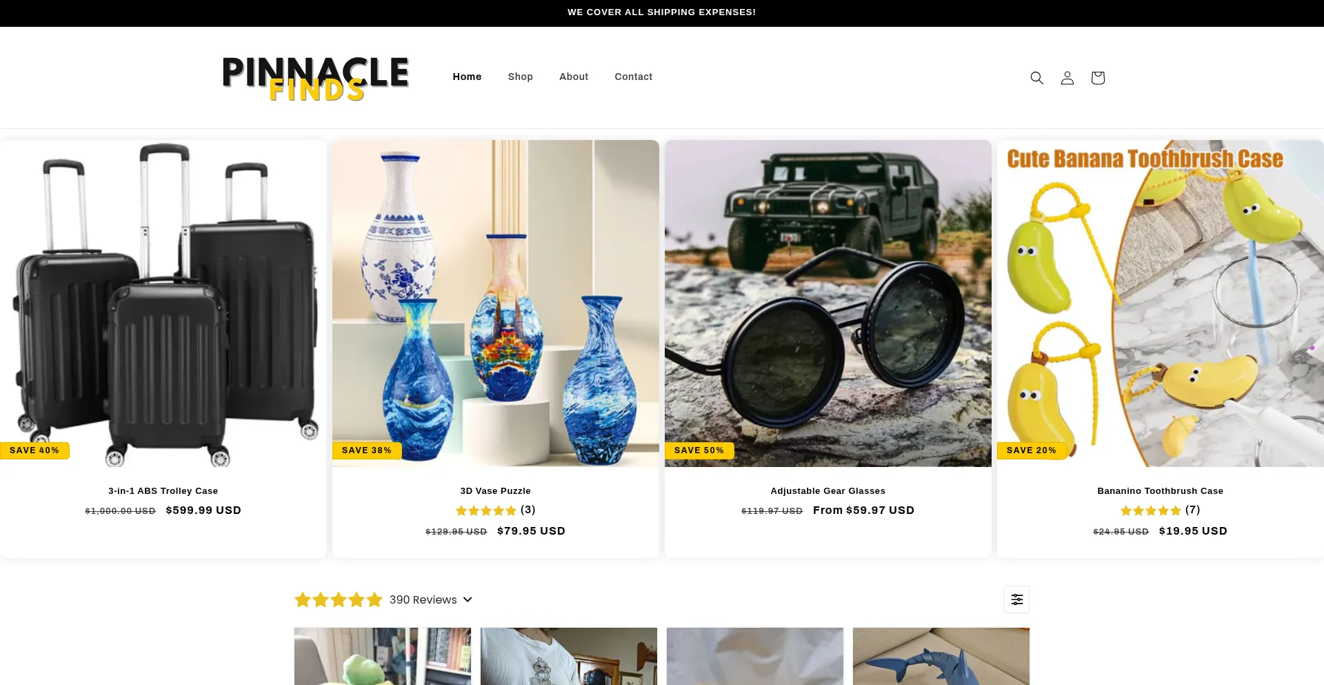 分析表明 pinnaclefinds.store 作为电子商务平台运营,促进商品或服务的在线交易。该网站实现了购物车功能、支付处理系统和产品目录功能,这些是商业零售运营的典型特征。