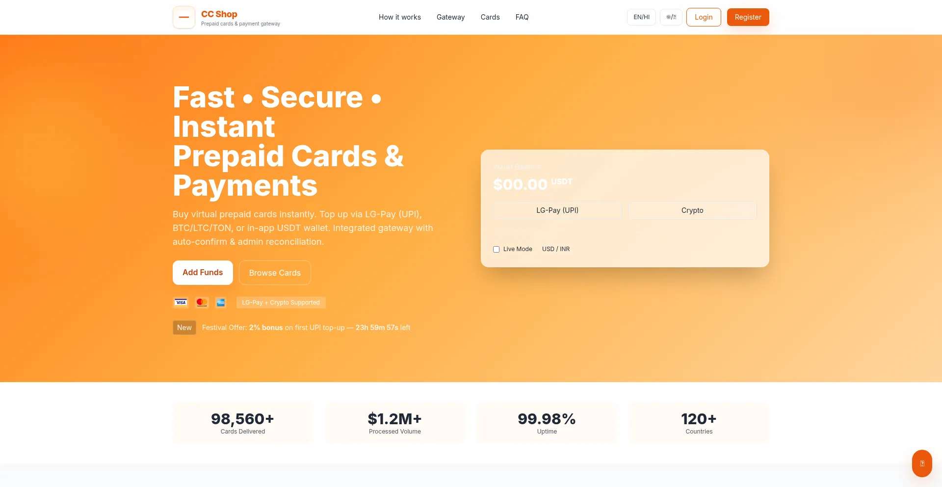 Fast, secure prepaid card marketplace with LG-Pay, UPI, and crypto gateway integration. Buy virtual cards instantly.