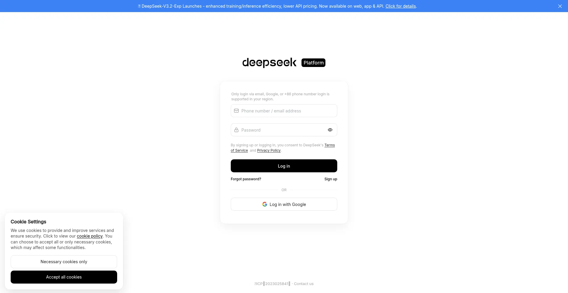 该网站实现符合GDPR或CCPA等隐私法规的cookie同意机制。这表明 platform.deepseek.com 遵守数据保护标准并为用户提供对个人数据收集实践的控制。