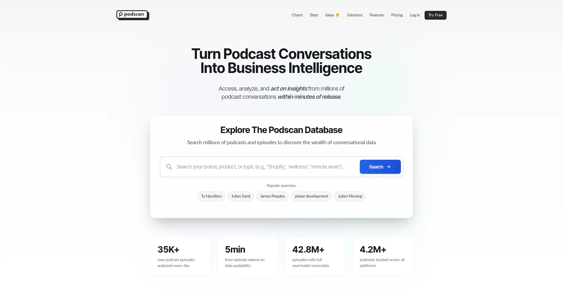 Access and analyze millions of podcast conversations within minutes of release. Real-time monitoring, AI-powered alerts, and comprehensive podcast analytics.