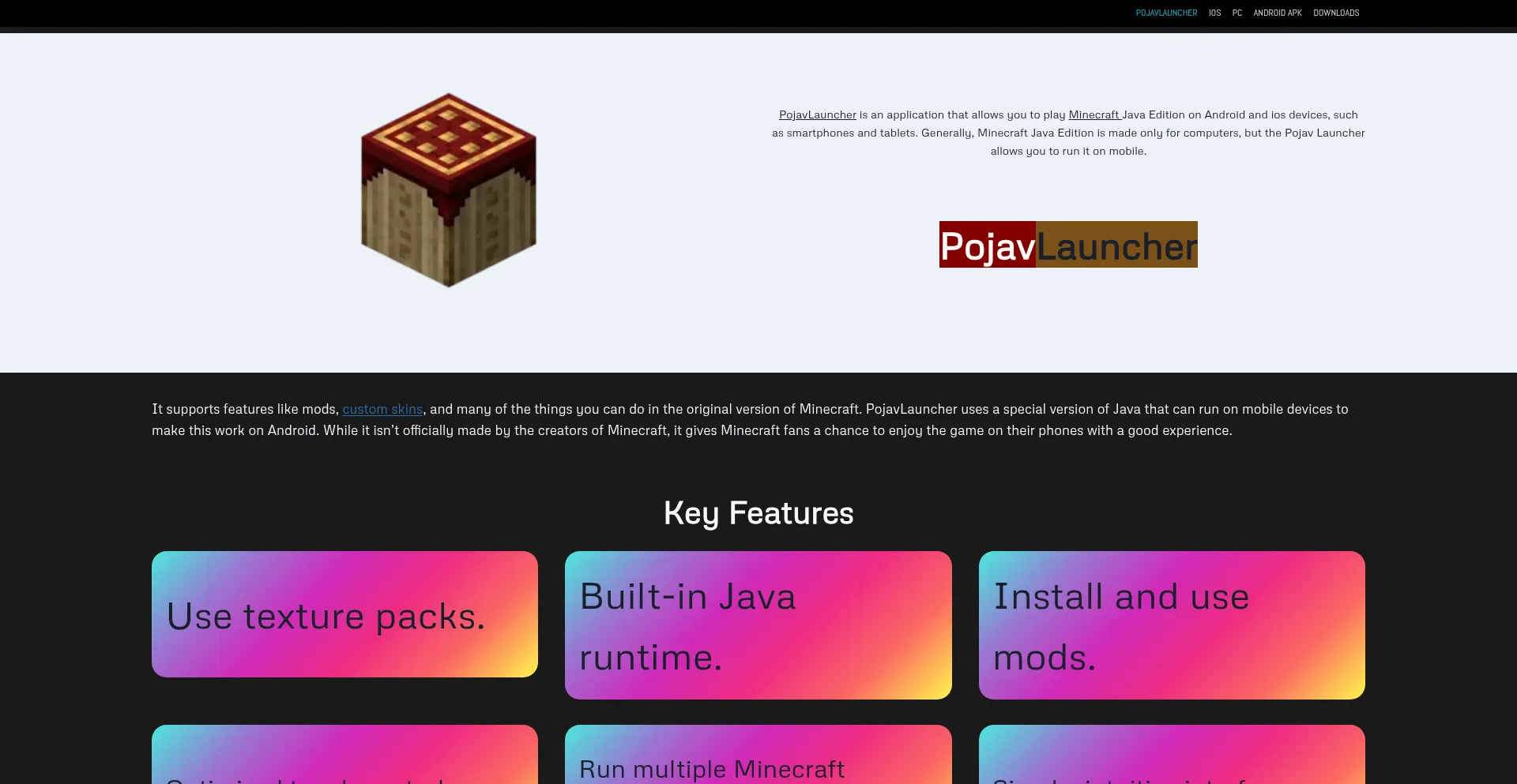 PojavLauncher is a powerful open-source Minecraft launcher for Android Apk, iOS and PC. PojavLauncher Built with performance and compatibility