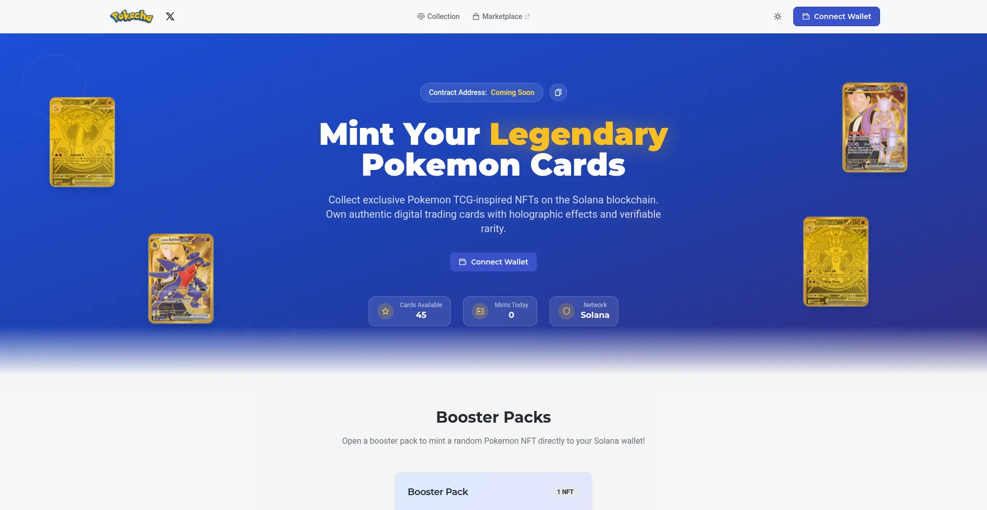 Open Pokemon gacha packs and mint exclusive TCG-inspired NFTs on the Solana blockchain. Collect rare, holographic digital trading cards featuring your favorite Pokemon. Connect ...