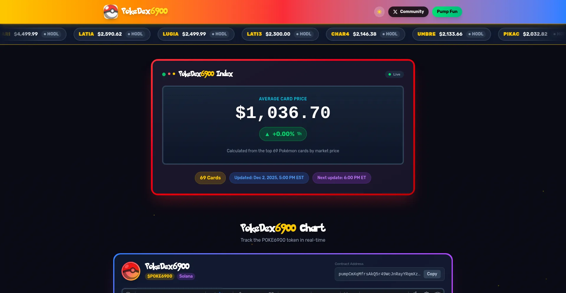 Track the top 69 most expensive Pokemon cards with our parody memecoin dashboard.