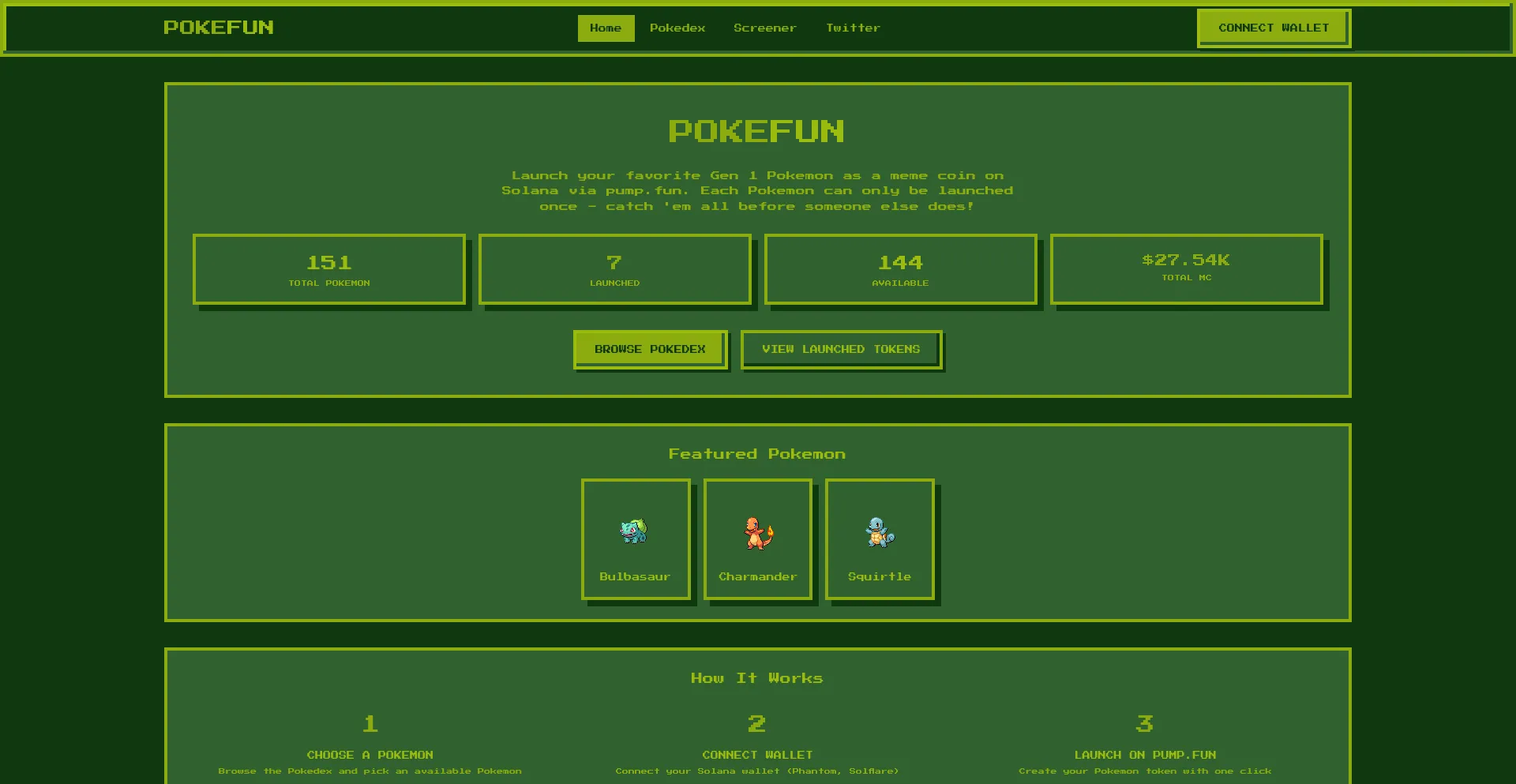 The ultimate Pokemon meme coin launchpad. Choose your favorite Gen 1 Pokemon and launch it on Solana via pump.fun. Each Pokemon can only be launched once!