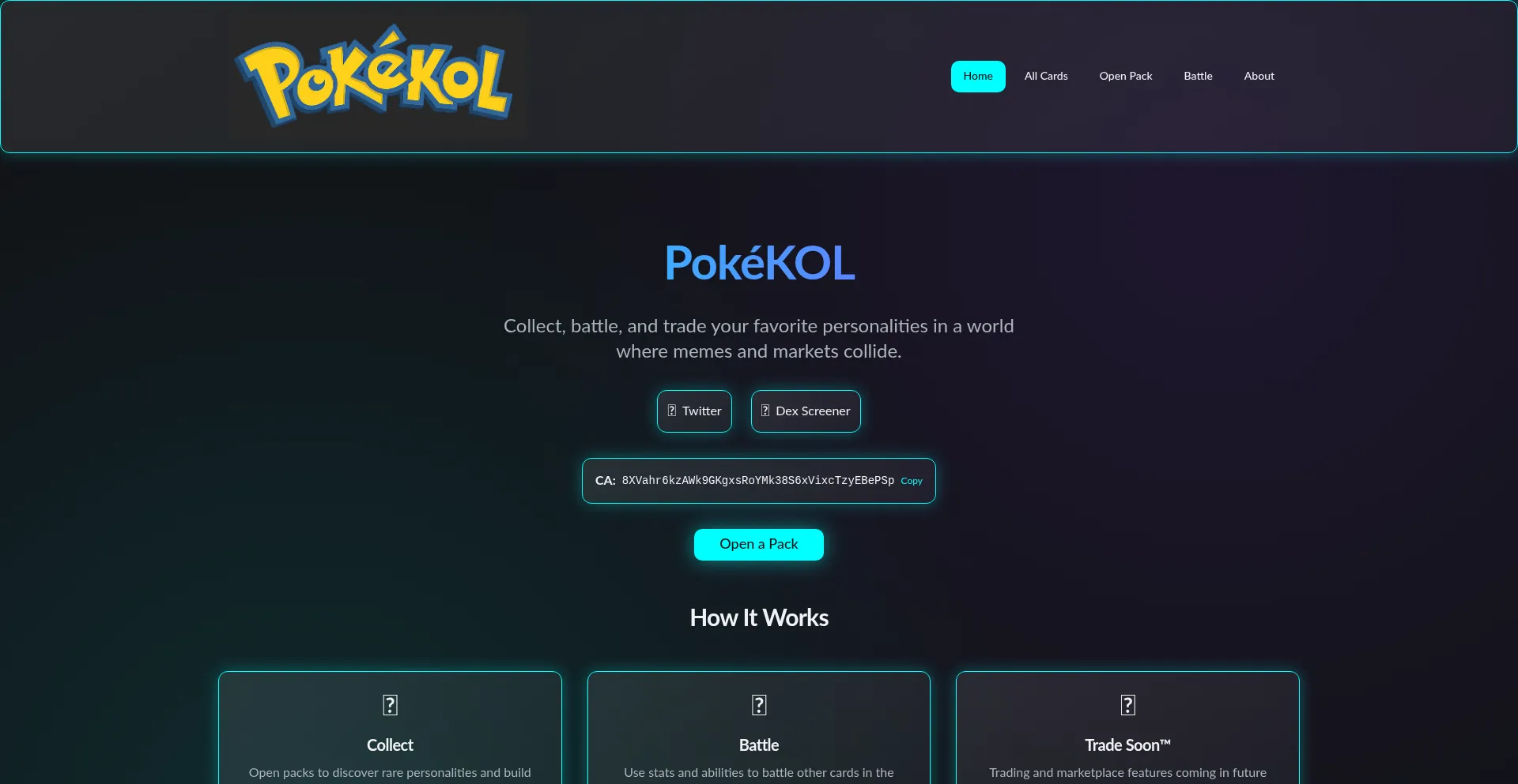 Collect, battle, and trade your favorite personalities in PokéKOL where memes and markets collide. Open packs, discover rare cards, and battle strategically.