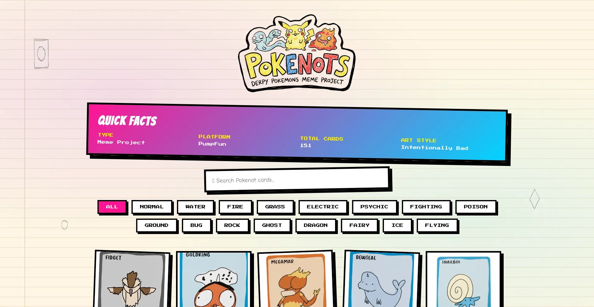 Collect all 151 hilariously derpy Pokenot trading cards. Meme-powered parody trading card series on PumpFun. Buy now!