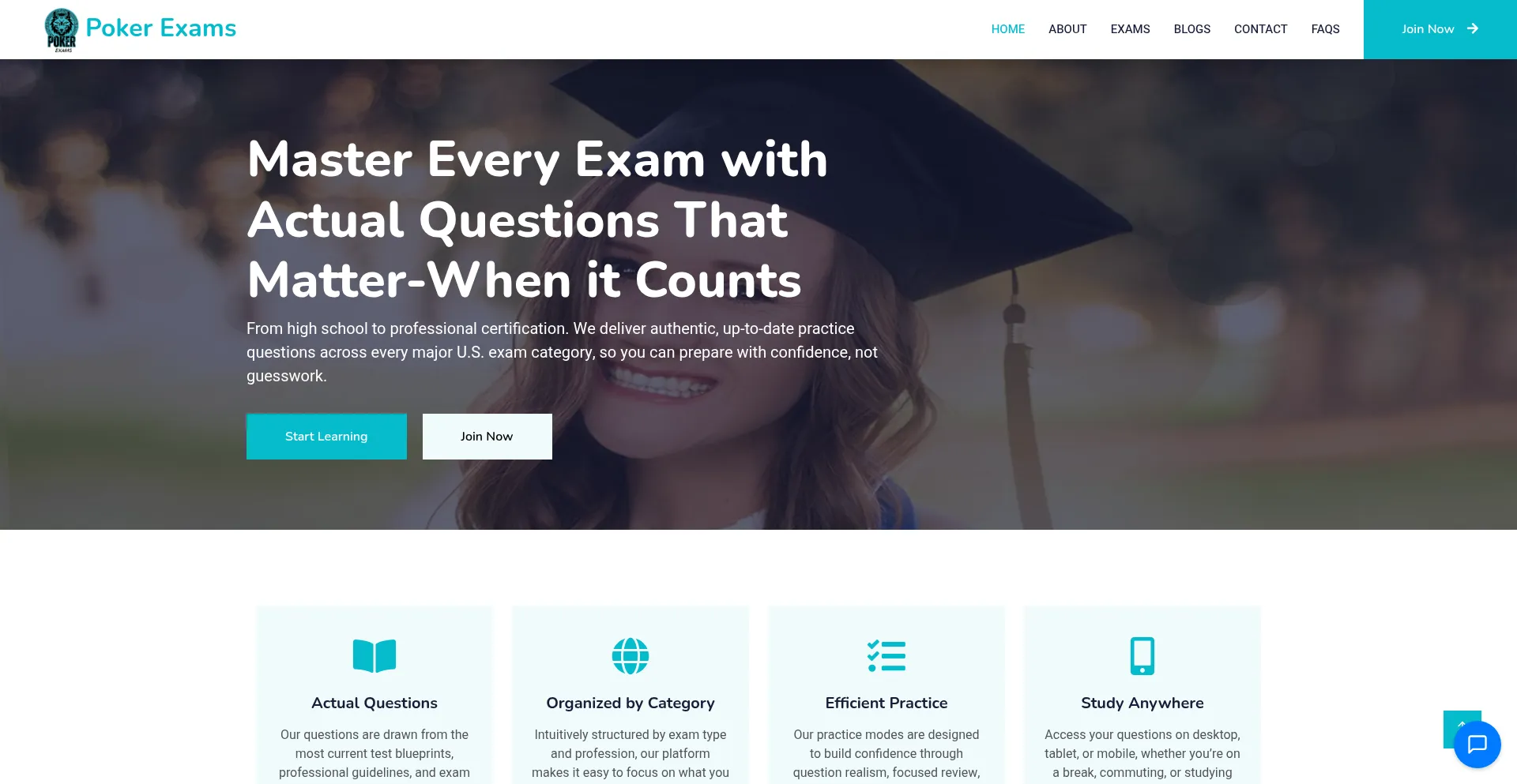 pokerexams.com 使用 Bootstrap,这是一个广泛采用的开源响应式网页开发框架。Bootstrap 通过标准化组件和样式实现移动友好界面的高效创建。