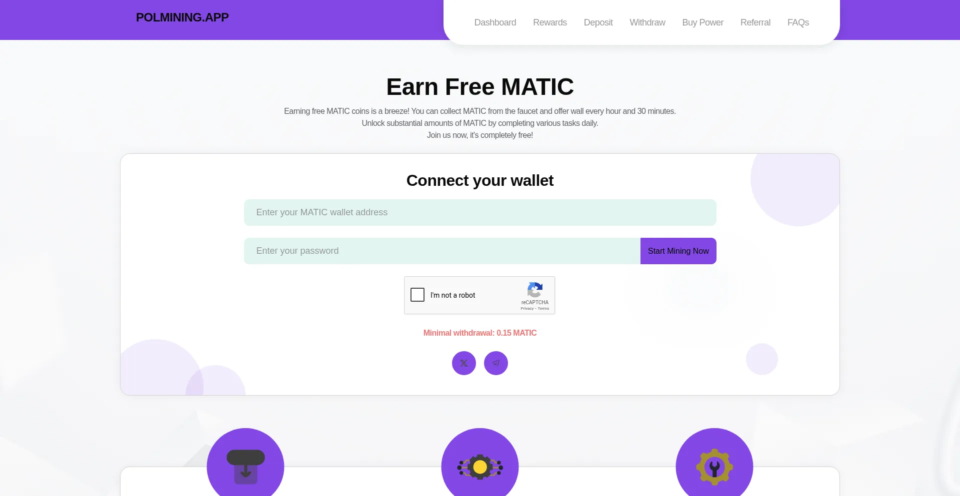 网站 polmining.app 可能提供云挖矿服务或加密货币挖矿投资。一些平台提供合法的挖矿租赁服务,而其他平台可能使用虚假的挖矿仪表板来显示无法提取的虚拟收益。