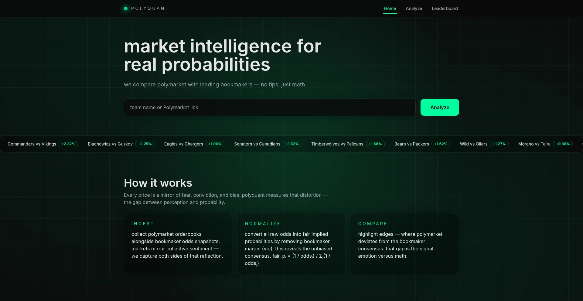 polyquant analyzes Polymarket and top bookmakers to surface real probability edges. No tips, just math.