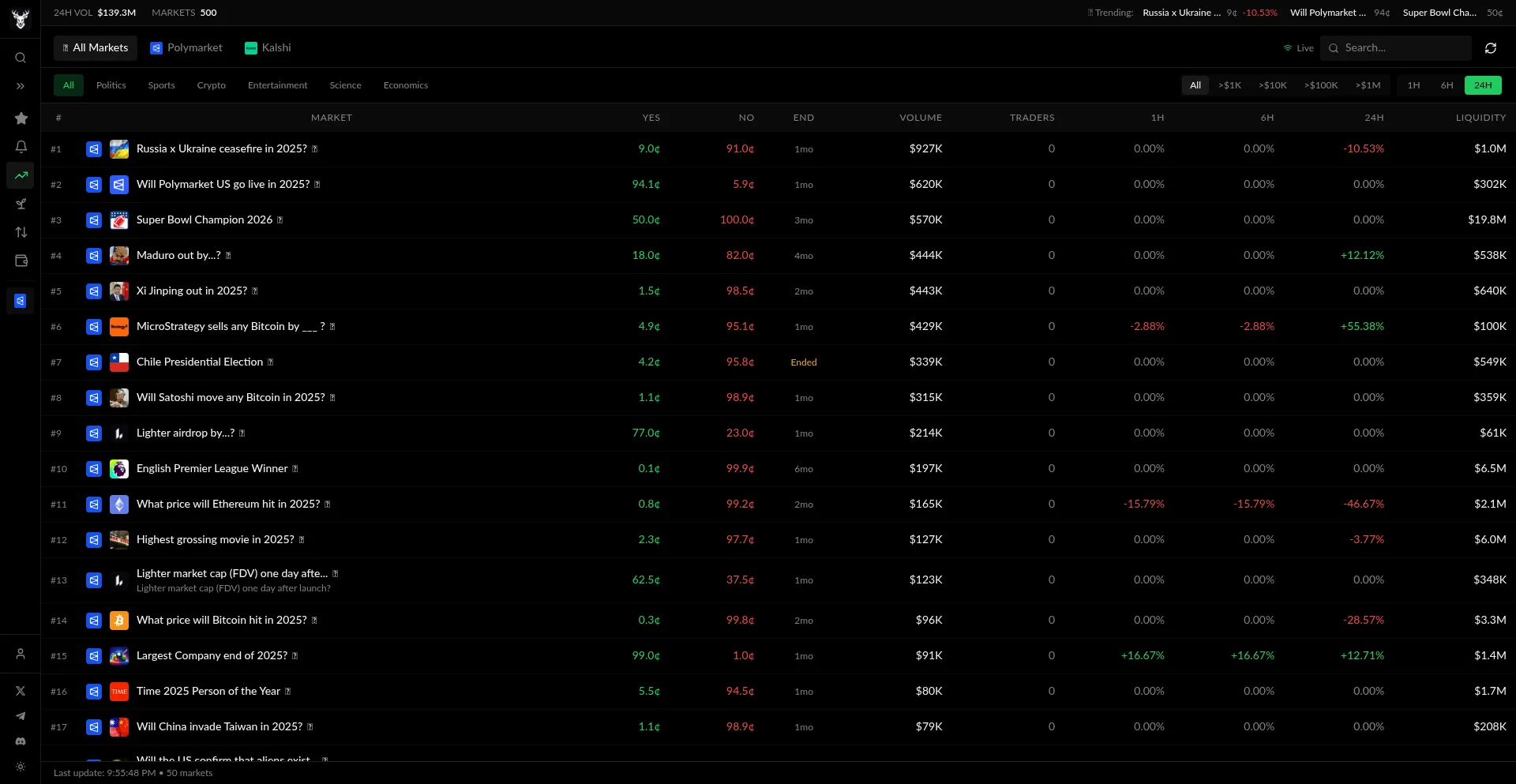 Track and analyze prediction markets from Polymarket, Kalshi, PredictIt, and more. Real-time odds, volume, and market data across all major platforms.