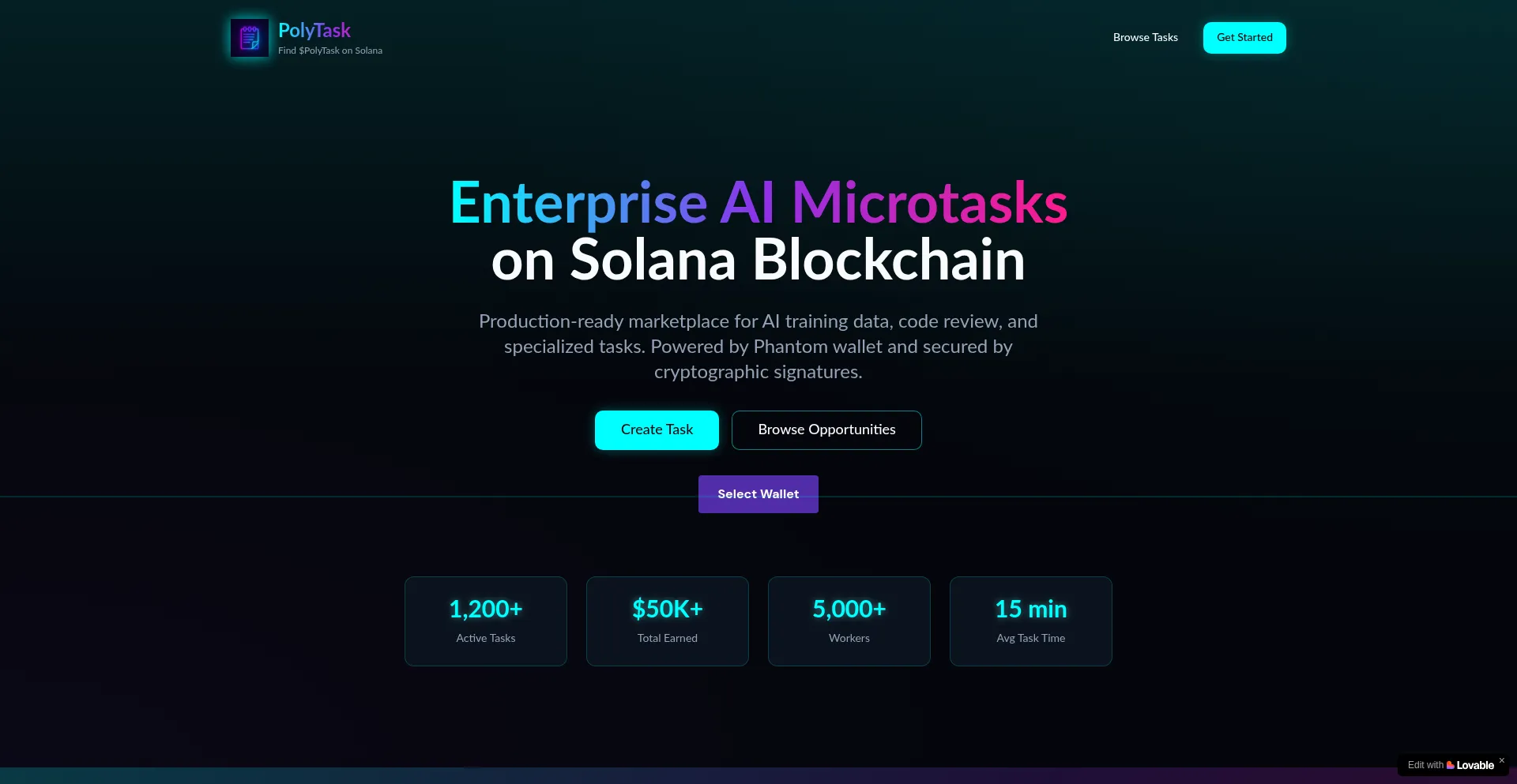 Professional AI microtask marketplace powered by Solana blockchain. Create tasks, earn SOL, build reputation. Secure escrow payments with Phantom wallet. Find $PolyTask token.