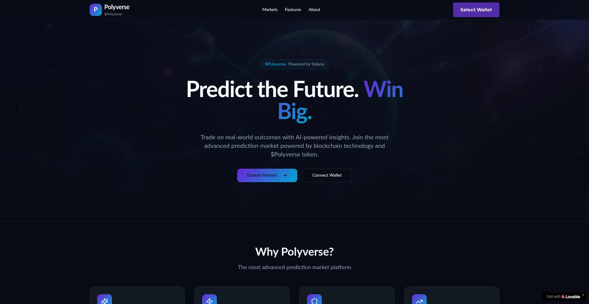 Trade on real-world outcomes with AI-powered insights. Join the most advanced prediction market powered by Solana blockchain and $Polyverse token.