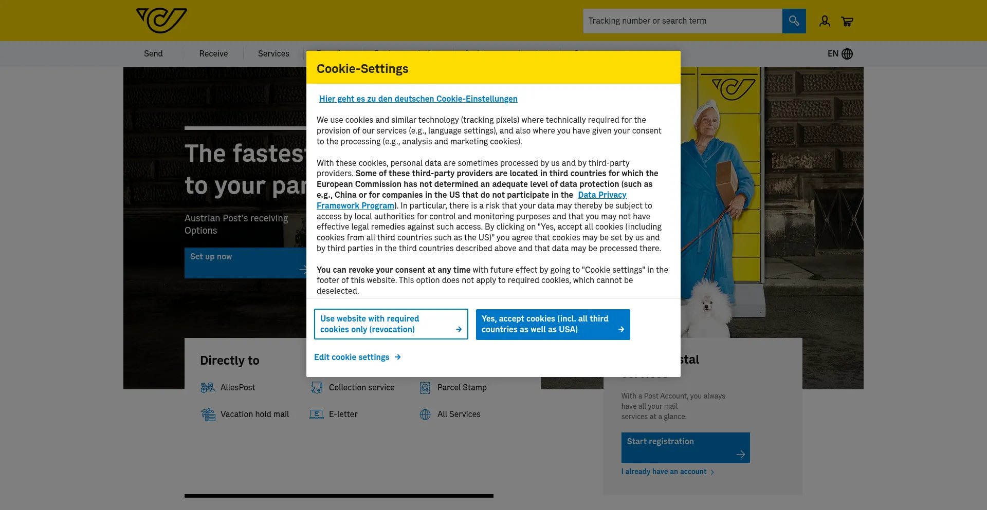 该网站实现符合GDPR或CCPA等隐私法规的cookie同意机制。这表明 post.at 遵守数据保护标准并为用户提供对个人数据收集实践的控制。