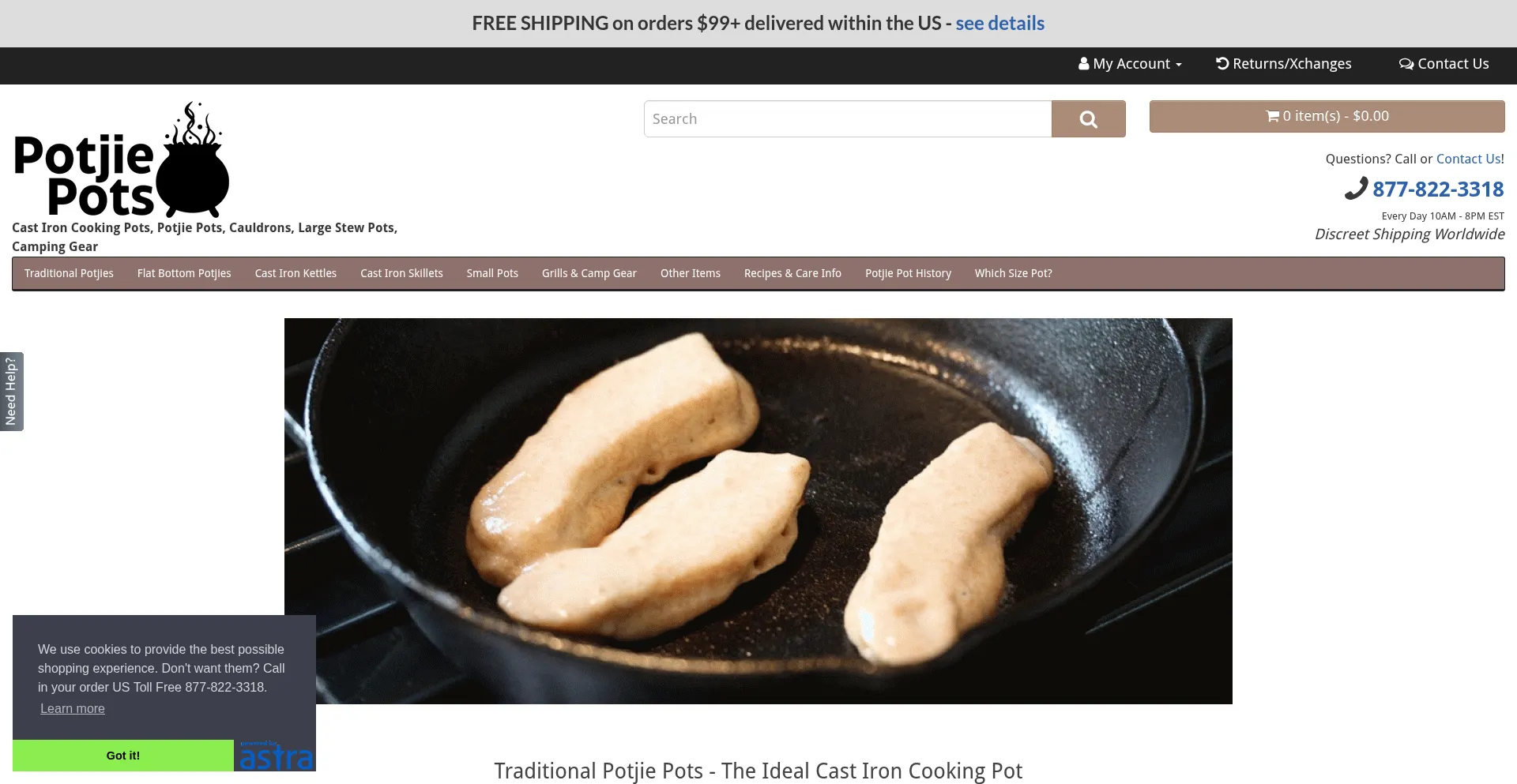 Cast iron cooking pots for campfires or home. Cast iron cauldrons, stew pots, skillets and more.