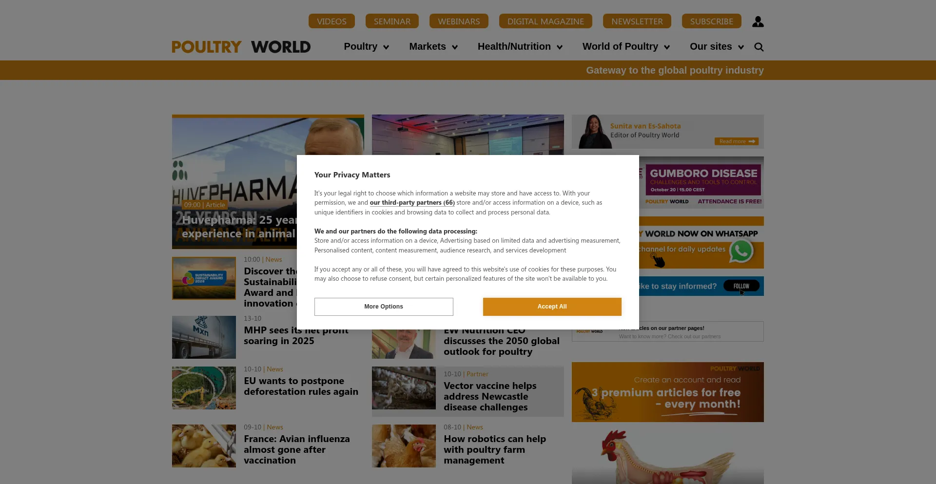 该网站实现符合GDPR或CCPA等隐私法规的cookie同意机制。这表明 poultryworld.net 遵守数据保护标准并为用户提供对个人数据收集实践的控制。