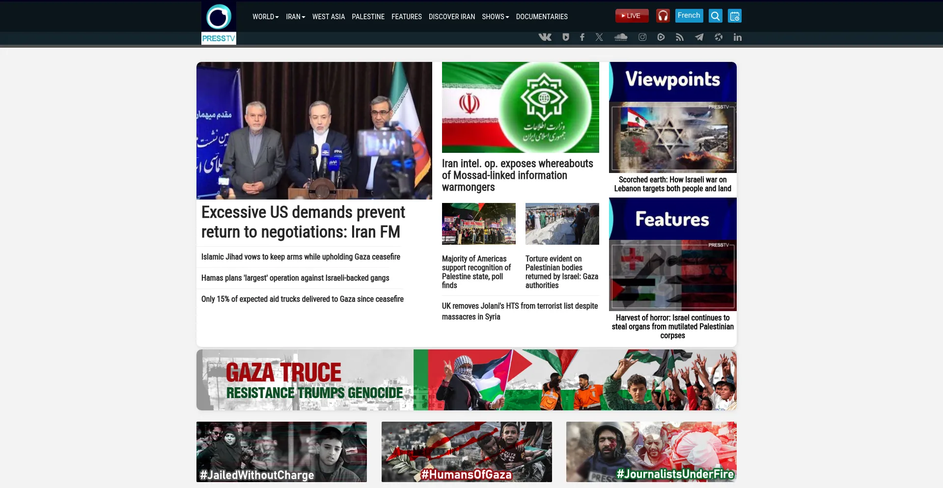 网站上存在社交媒体链接表明 presstv.ir 在社交媒体上维护官方账户,这是可信度和参与度的积极信号。