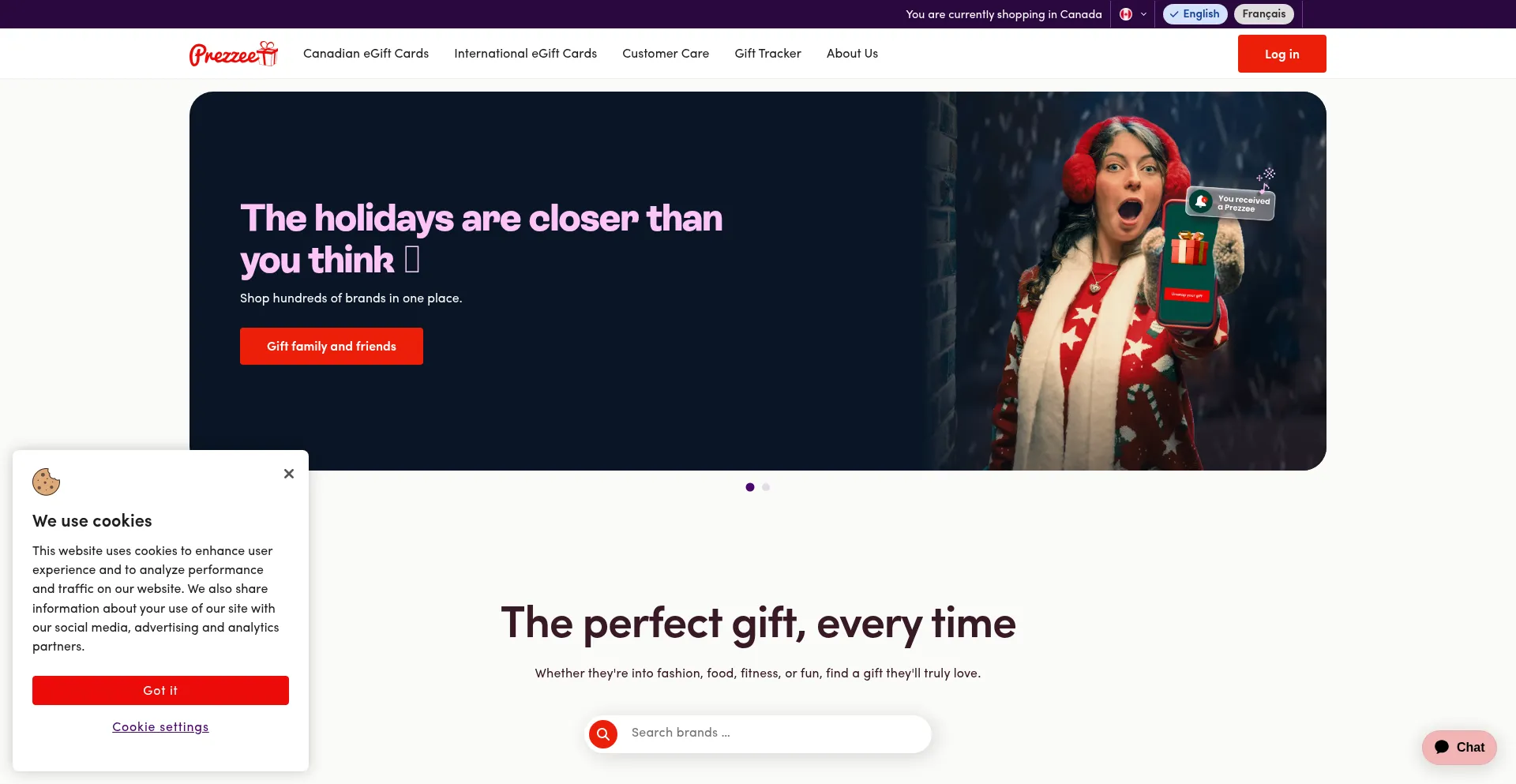 该网站实现符合GDPR或CCPA等隐私法规的cookie同意机制。这表明 prezzee.ca 遵守数据保护标准并为用户提供对个人数据收集实践的控制。