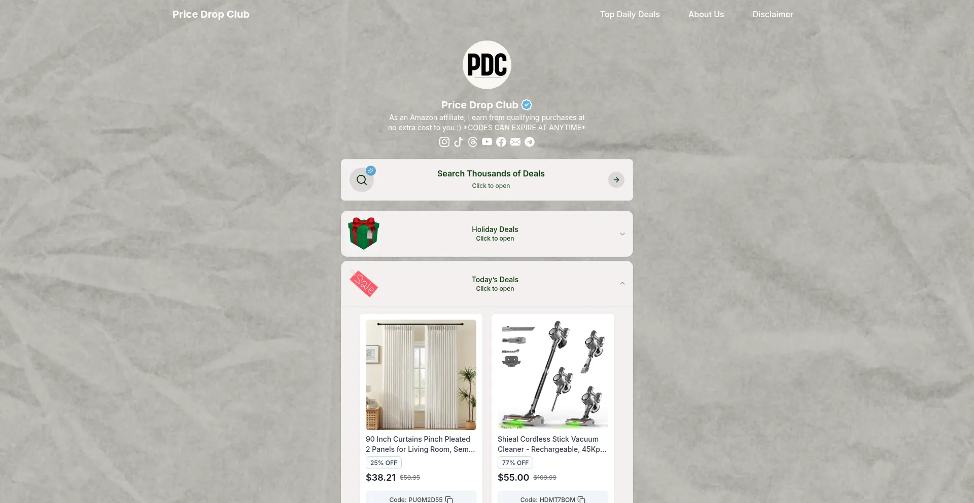 网站上存在社交媒体链接表明 pricedropclub.com 在社交媒体上维护官方账户,这是可信度和参与度的积极信号。