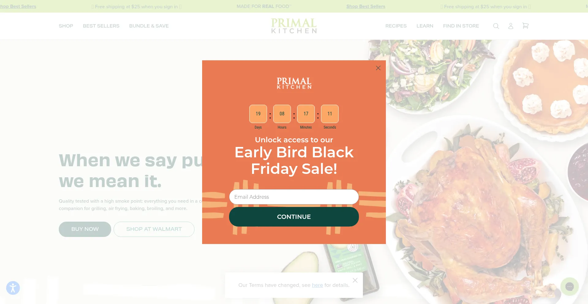 该网站实现数据收集表单,请求个人信息,包括姓名、电子邮件地址、电话号码或其他敏感详细信息。用户应验证 primalkitchen.com 的合法性并在提交个人数据前查看隐私政策。