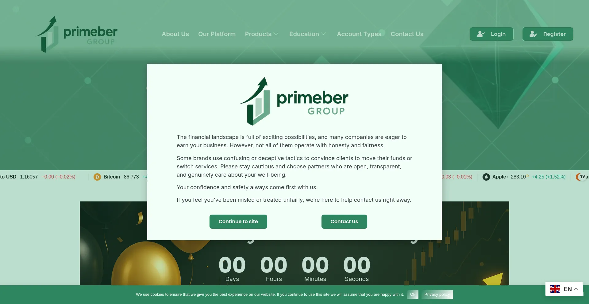 该网站实现数据收集表单,请求个人信息,包括姓名、电子邮件地址、电话号码或其他敏感详细信息。用户应验证 primebergroup.com 的合法性并在提交个人数据前查看隐私政策。