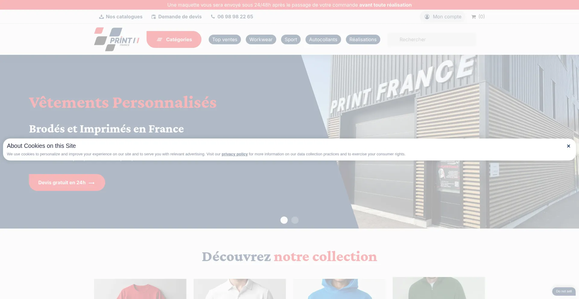 该网站实现符合GDPR或CCPA等隐私法规的cookie同意机制。这表明 print-france.fr 遵守数据保护标准并为用户提供对个人数据收集实践的控制。