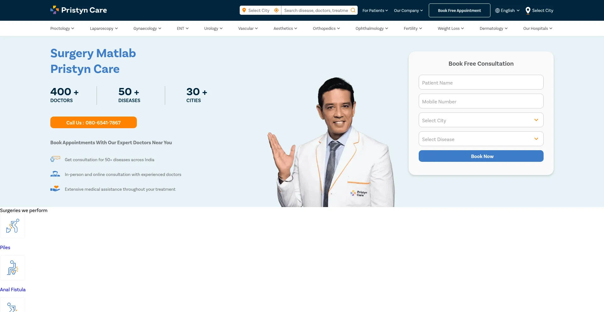 Provides Seamless Surgical treatments for 50+ diseases such as Piles, Fissure, Hernia, Kidney Stone, ENT conditions etc. in India. Book an Appointment with our experienced surge...