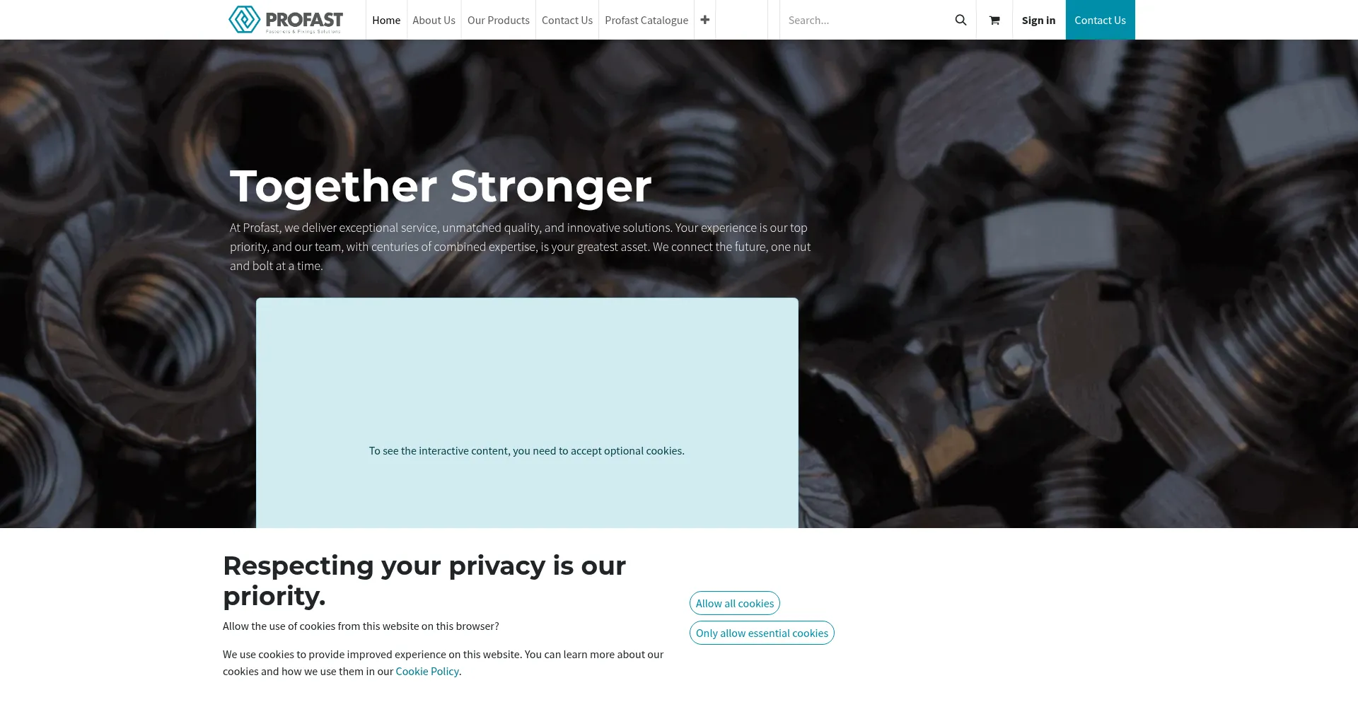 该网站实现符合GDPR或CCPA等隐私法规的cookie同意机制。这表明 profast.co.uk 遵守数据保护标准并为用户提供对个人数据收集实践的控制。
