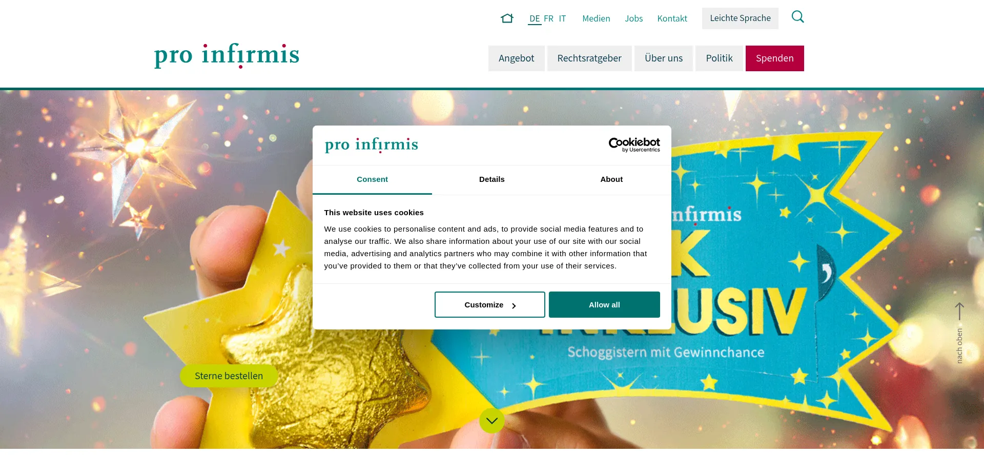 该网站实现符合GDPR或CCPA等隐私法规的cookie同意机制。这表明 proinfirmis.ch 遵守数据保护标准并为用户提供对个人数据收集实践的控制。