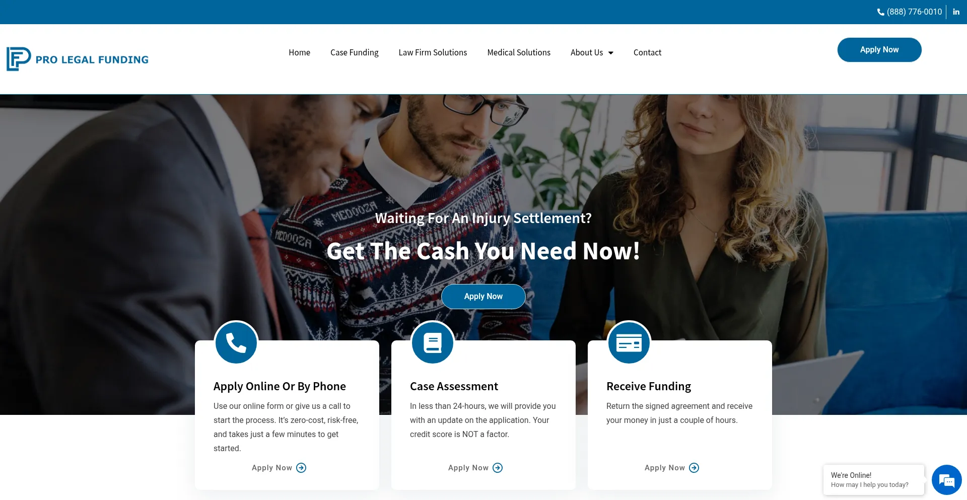 该网站实现数据收集表单,请求个人信息,包括姓名、电子邮件地址、电话号码或其他敏感详细信息。用户应验证 prolegalfunding.com 的合法性并在提交个人数据前查看隐私政策。