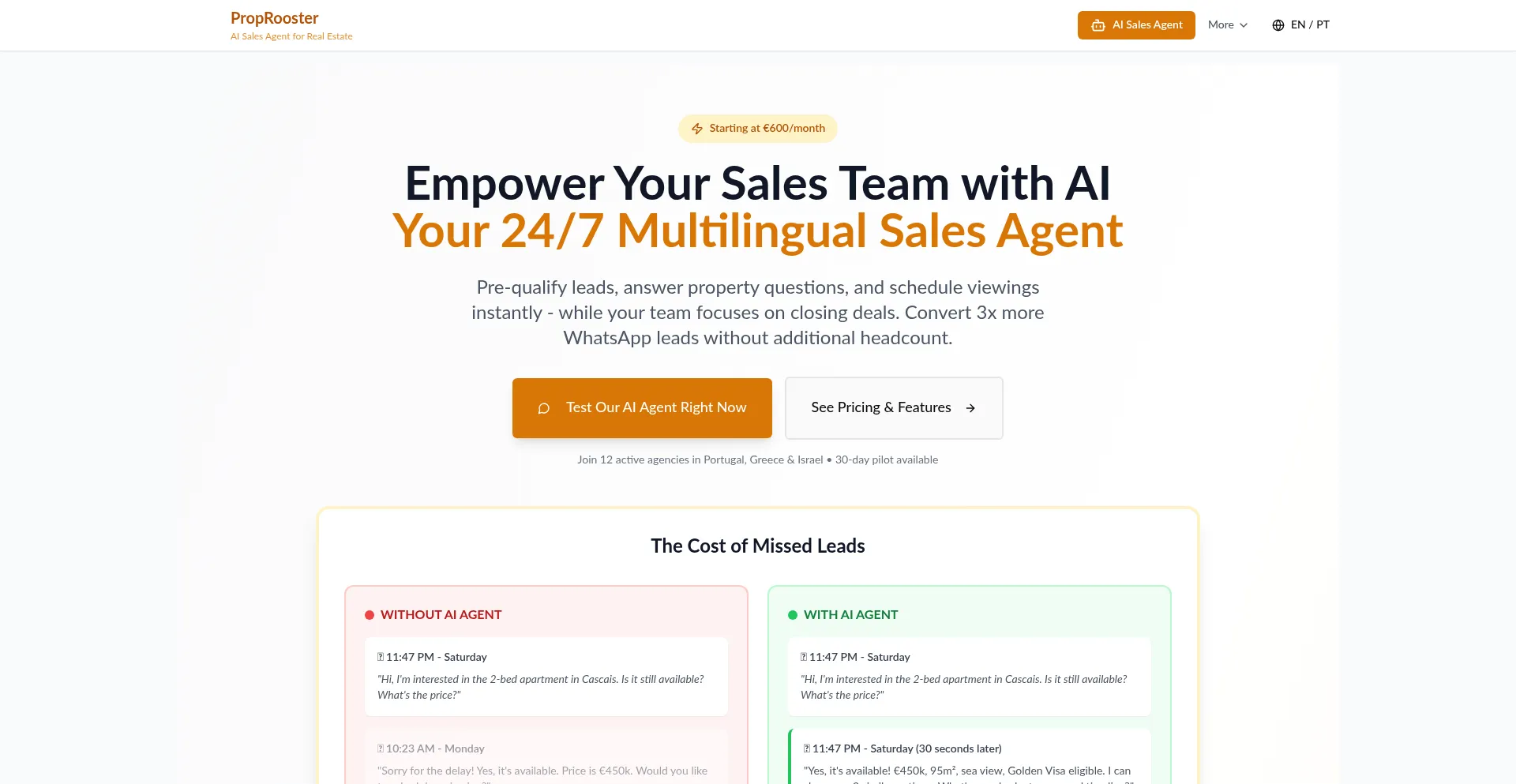 AI sales agent for real estate. Qualifies WhatsApp leads, answers property questions in 5+ languages, and books viewings 24/7. Built for agencies with foreign buyers — replace...