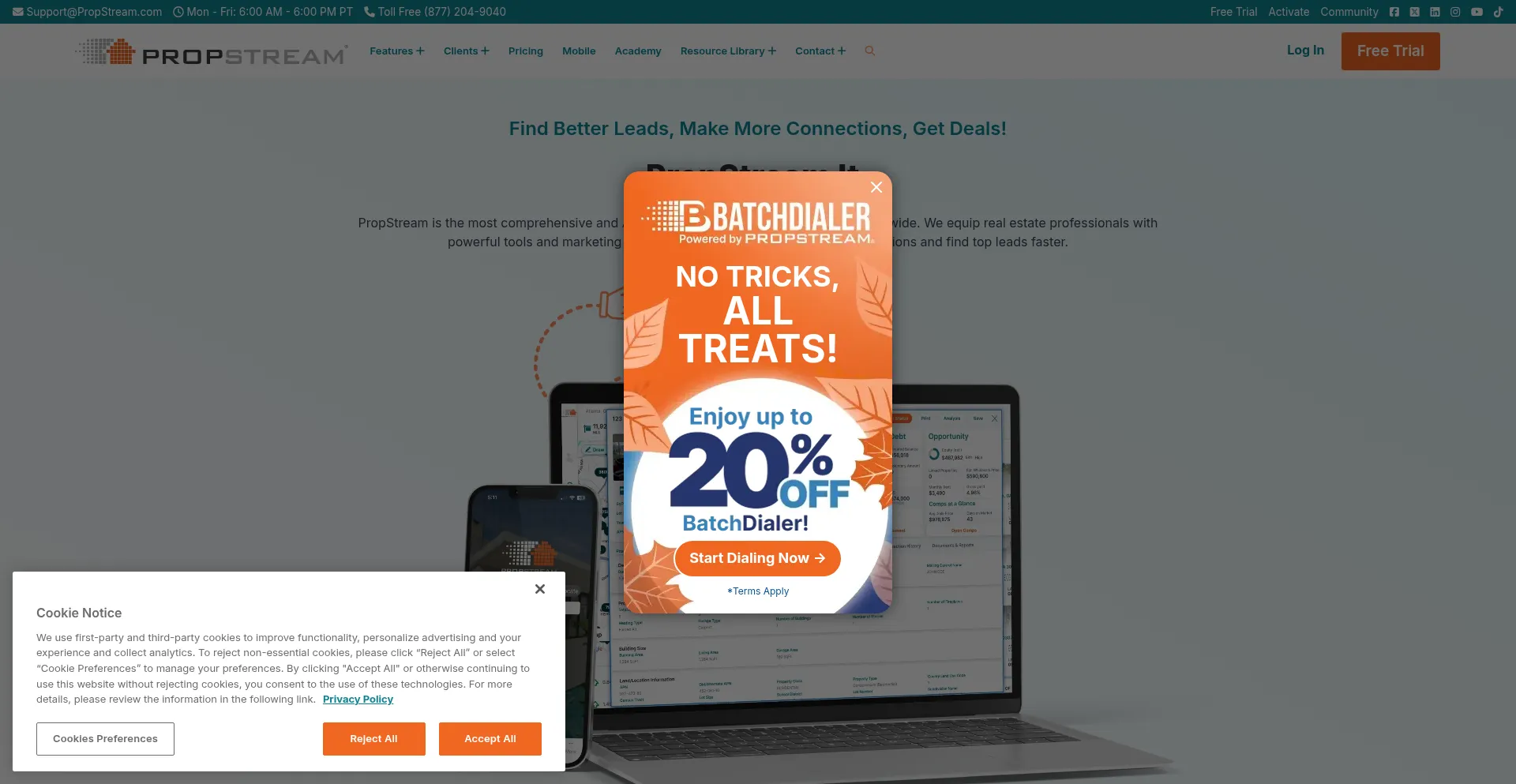 该网站实现数据收集表单,请求个人信息,包括姓名、电子邮件地址、电话号码或其他敏感详细信息。用户应验证 propstream.com 的合法性并在提交个人数据前查看隐私政策。