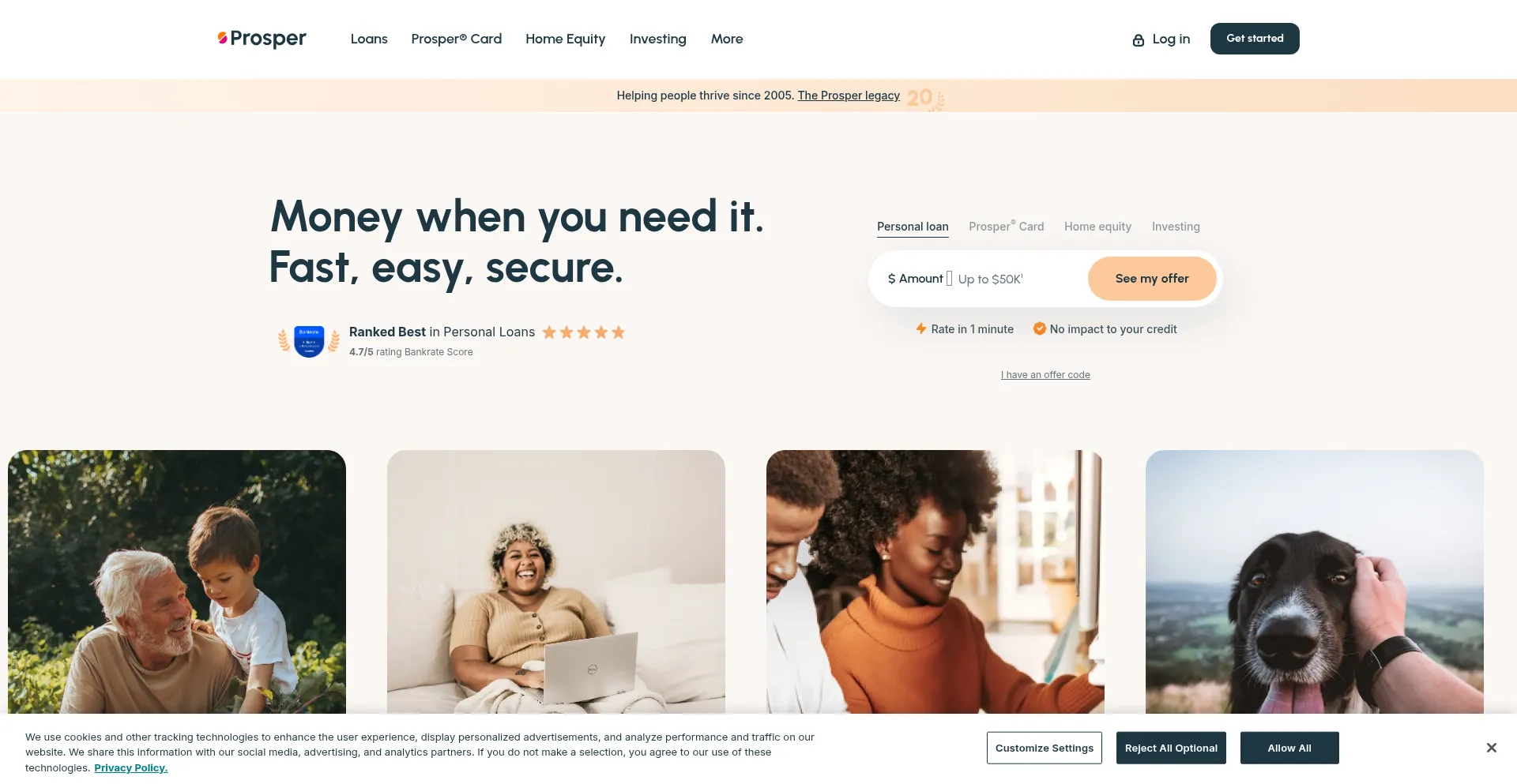 该网站实现符合GDPR或CCPA等隐私法规的cookie同意机制。这表明 prosper.com 遵守数据保护标准并为用户提供对个人数据收集实践的控制。