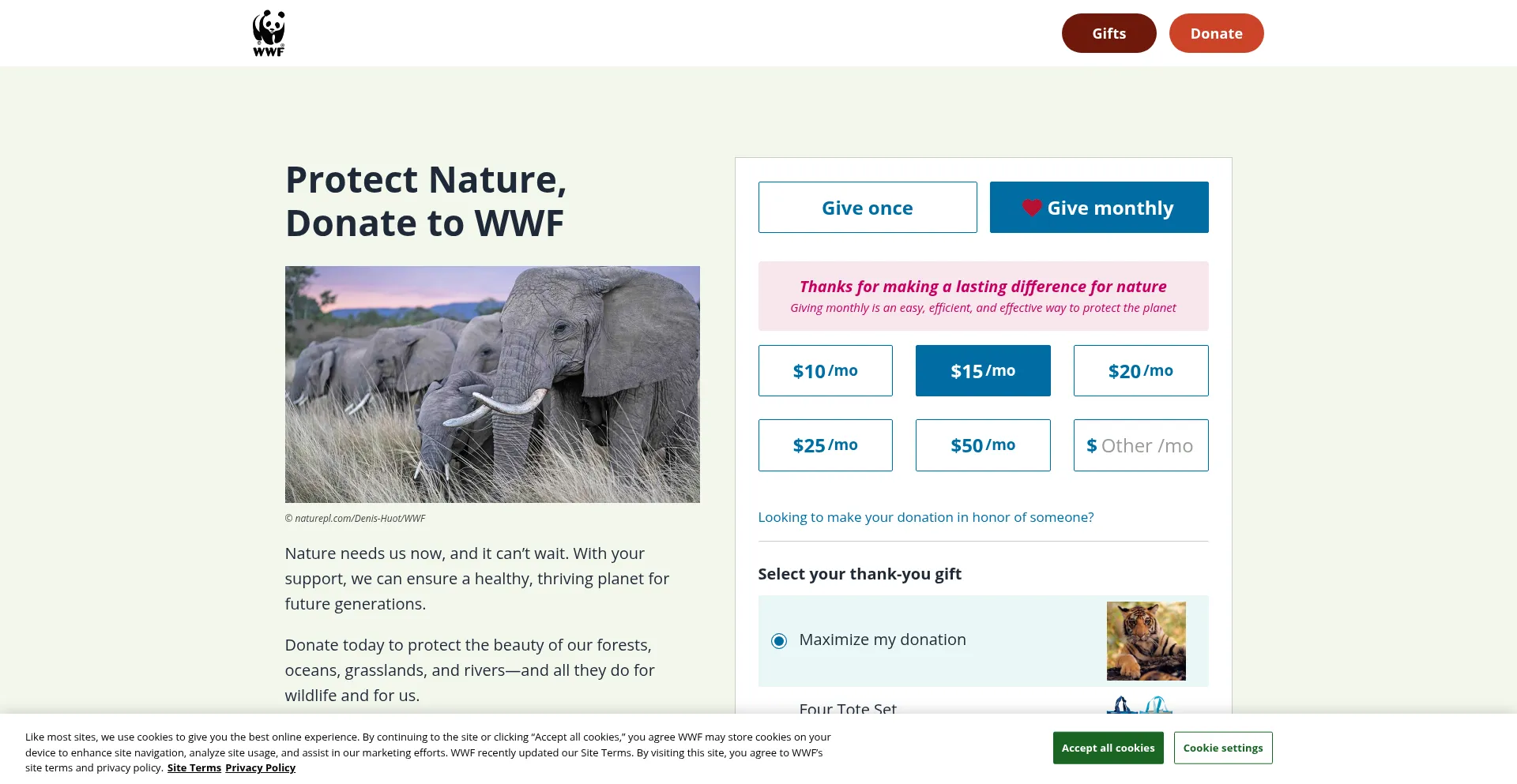 该网站实现符合GDPR或CCPA等隐私法规的cookie同意机制。这表明 protect.worldwildlife.org 遵守数据保护标准并为用户提供对个人数据收集实践的控制。