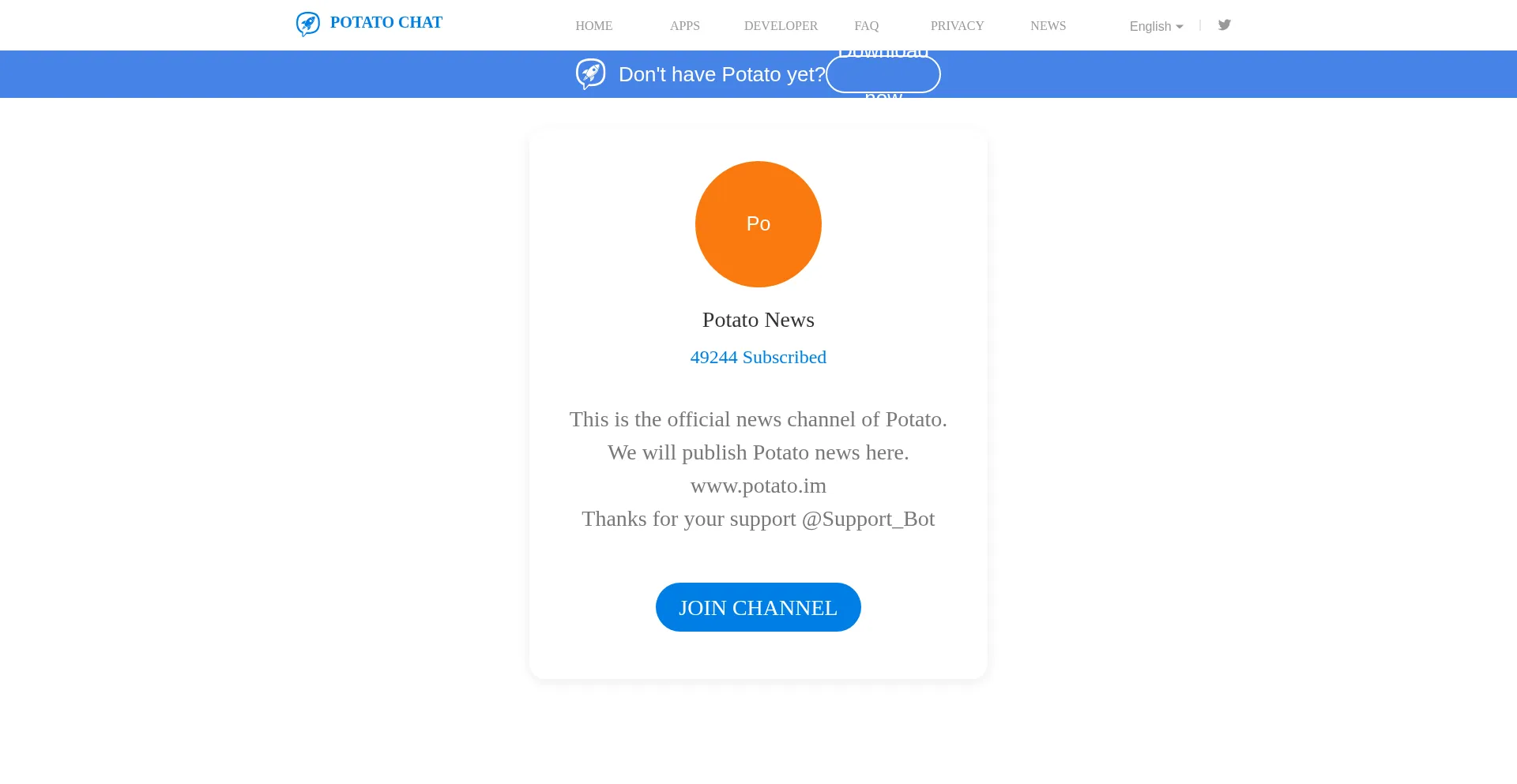 This is the official news channel of Potato. We will publish Potato news here. www.potato.im Thanks for your support @Support_Bot