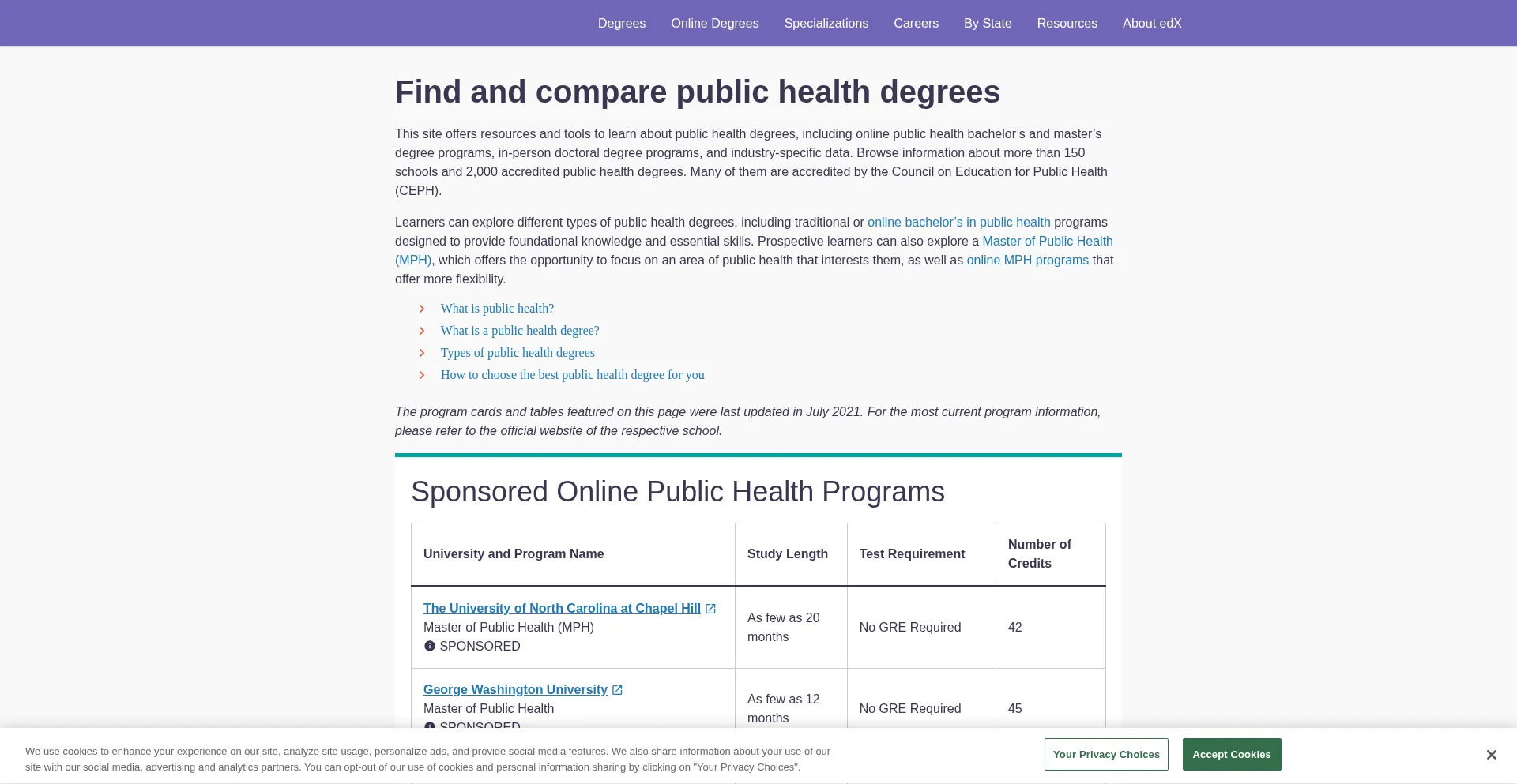 该网站实现符合GDPR或CCPA等隐私法规的cookie同意机制。这表明 publichealthdegrees.org 遵守数据保护标准并为用户提供对个人数据收集实践的控制。