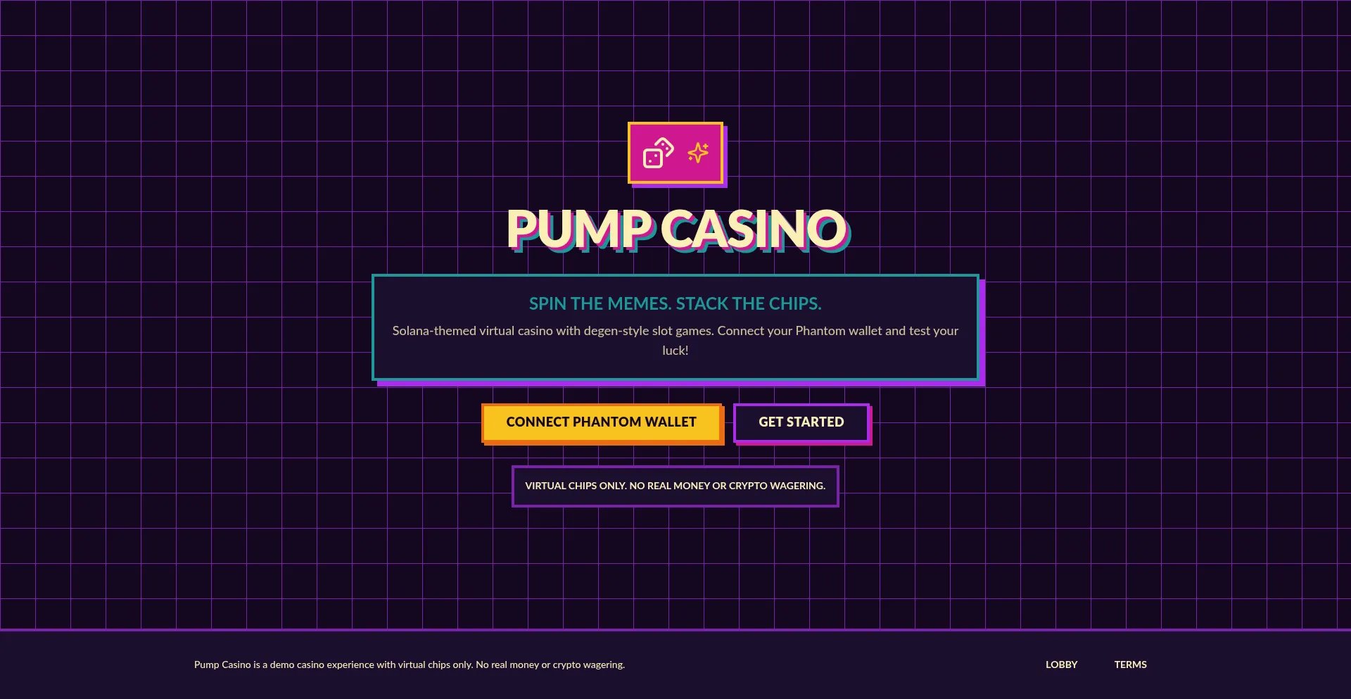 Pump Casino: Solana-themed virtual casino with degen-style slot games. Spin reels, test strategies with free chips. No real money wagering.
