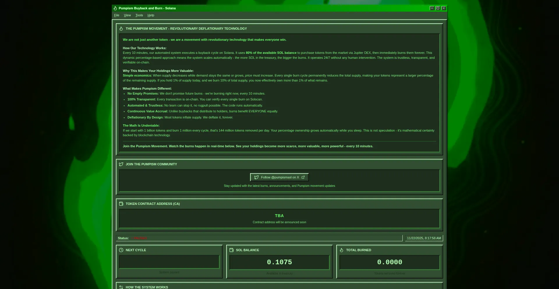 Pumpism - The revolutionary deflationary token movement. Automated buyback and burn every 10 minutes on Solana. Watch the supply shrink in real-time.