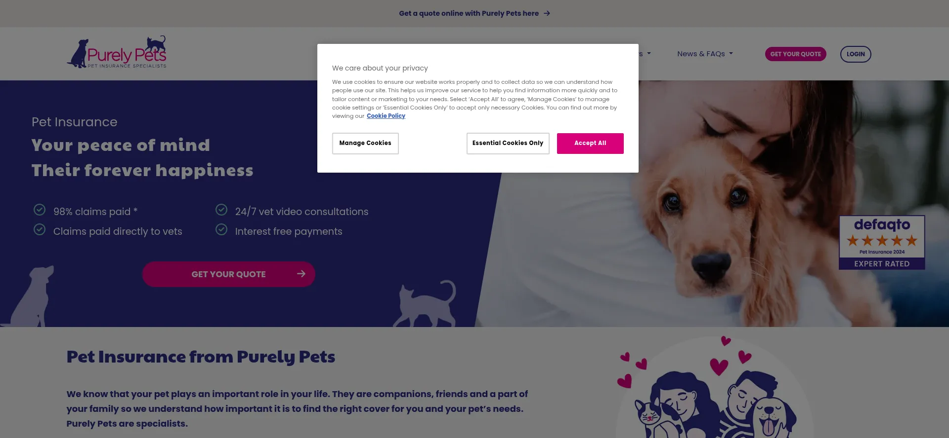 该网站实现符合GDPR或CCPA等隐私法规的cookie同意机制。这表明 purelypetsinsurance.co.uk 遵守数据保护标准并为用户提供对个人数据收集实践的控制。
