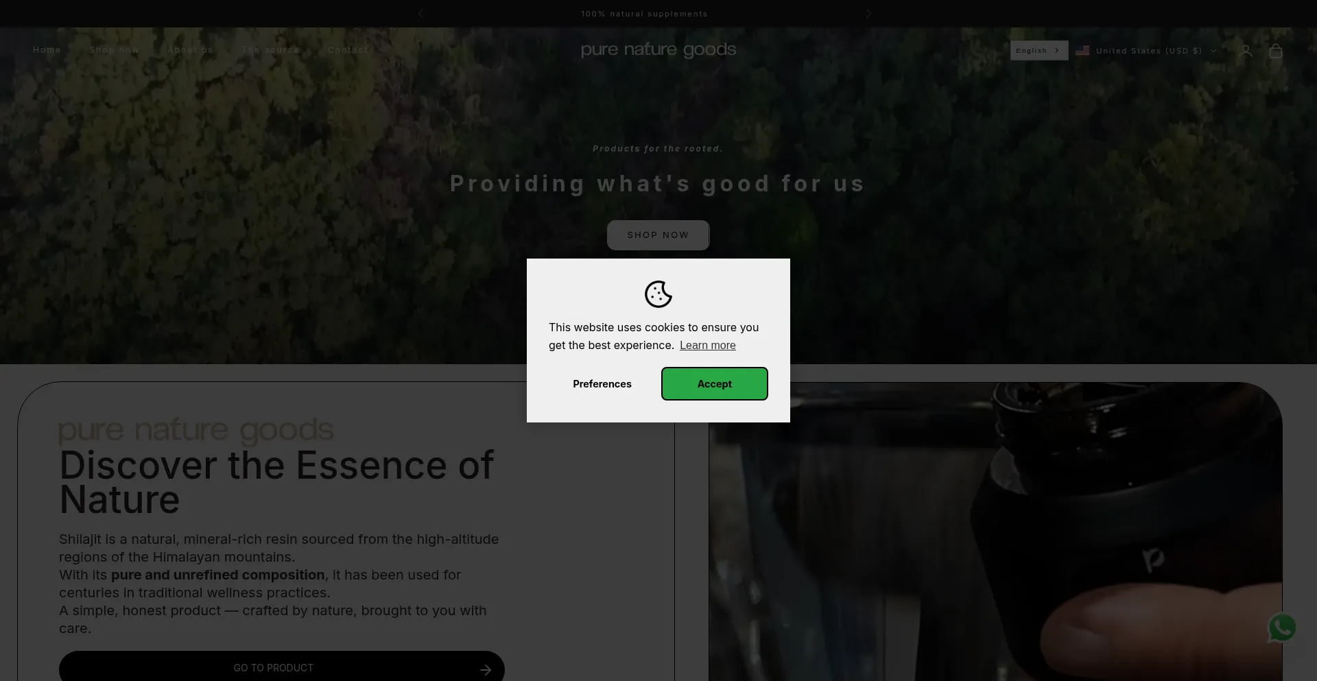 该网站实现符合GDPR或CCPA等隐私法规的cookie同意机制。这表明 purenaturegoods.com 遵守数据保护标准并为用户提供对个人数据收集实践的控制。