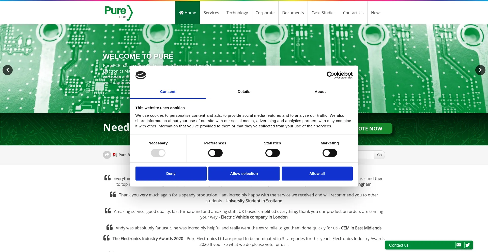 该网站实现符合GDPR或CCPA等隐私法规的cookie同意机制。这表明 purepcb.co.uk 遵守数据保护标准并为用户提供对个人数据收集实践的控制。