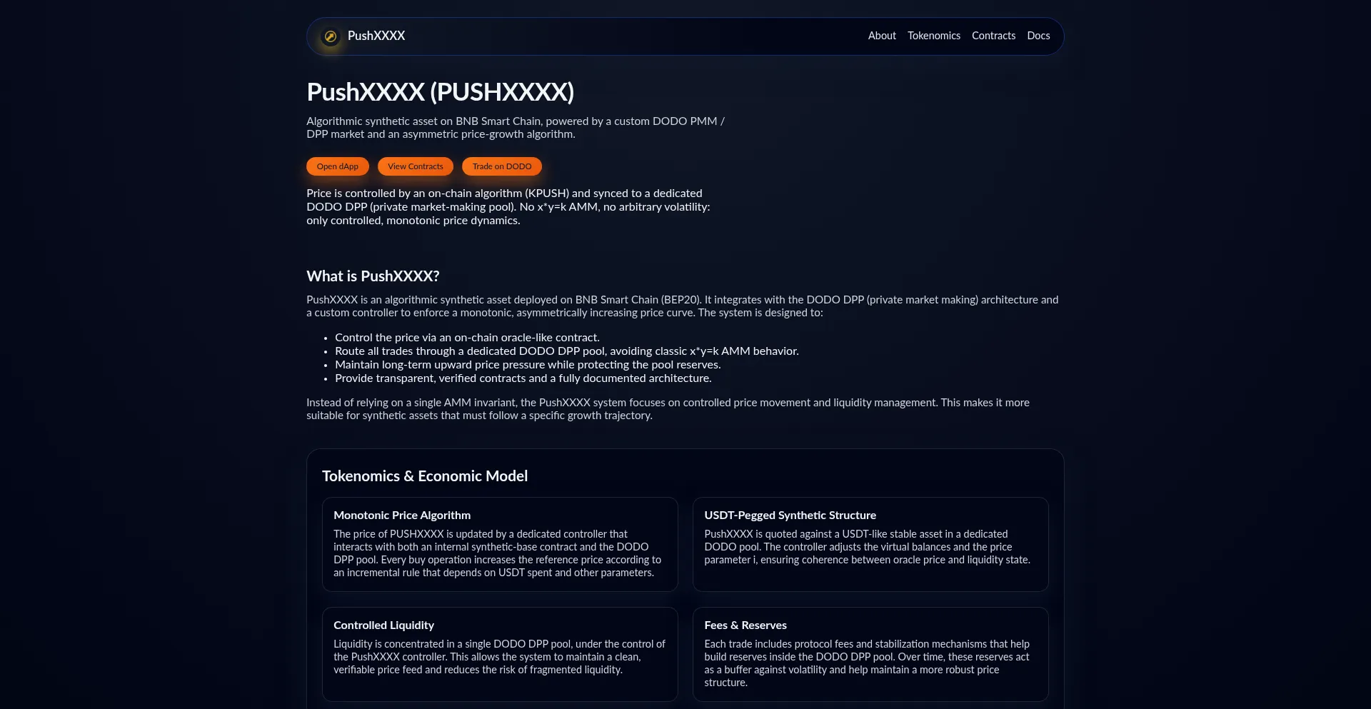 PushXXXX (PUSHXXXX) is an algorithmic synthetic asset on BNB Smart Chain, powered by a custom DODO PMM / DPP market with a controlled price algorithm.