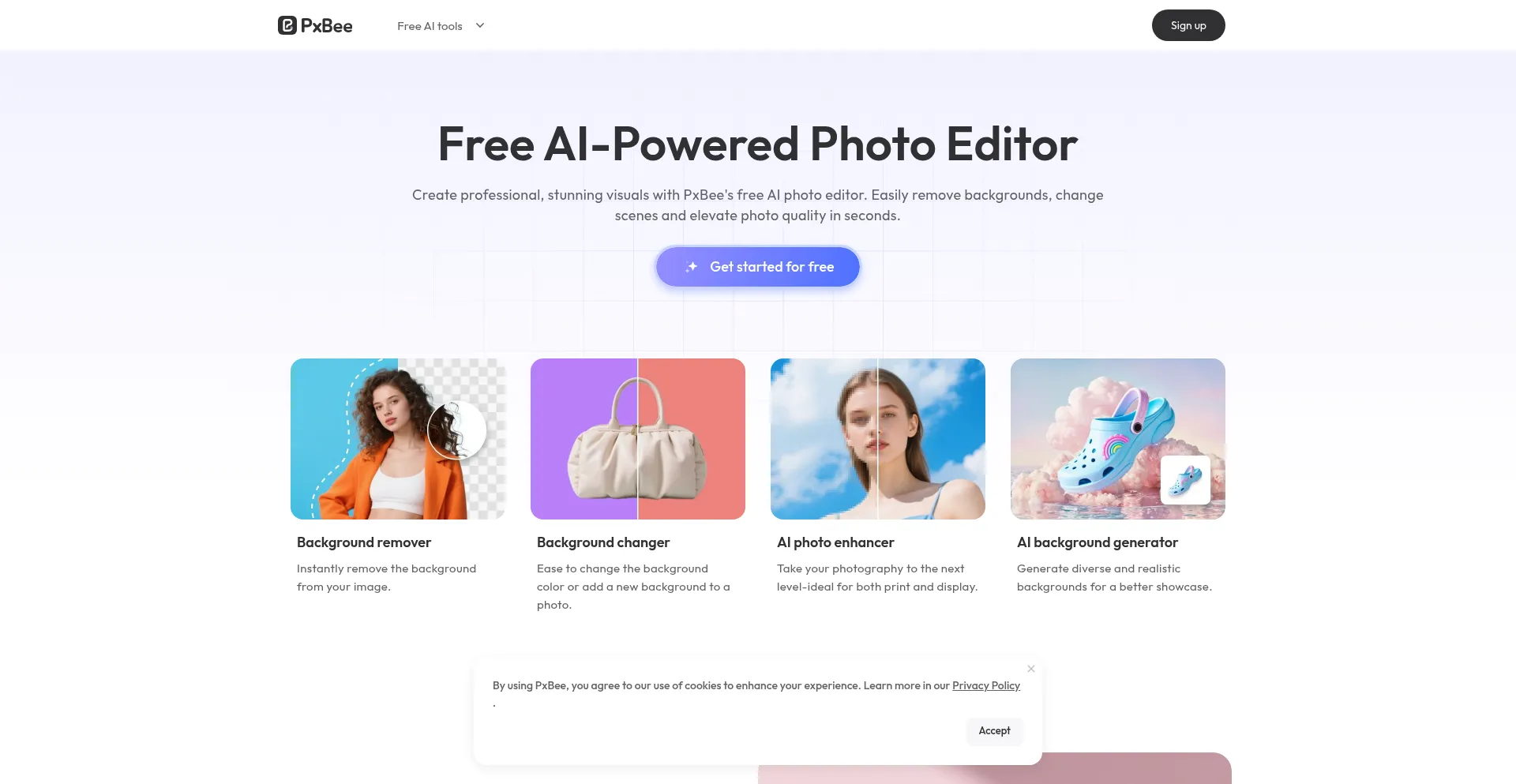 PxBee lets you create studio-quality images in seconds. Effortlessly remove backgrounds, change background, and enhance resolution with AI.